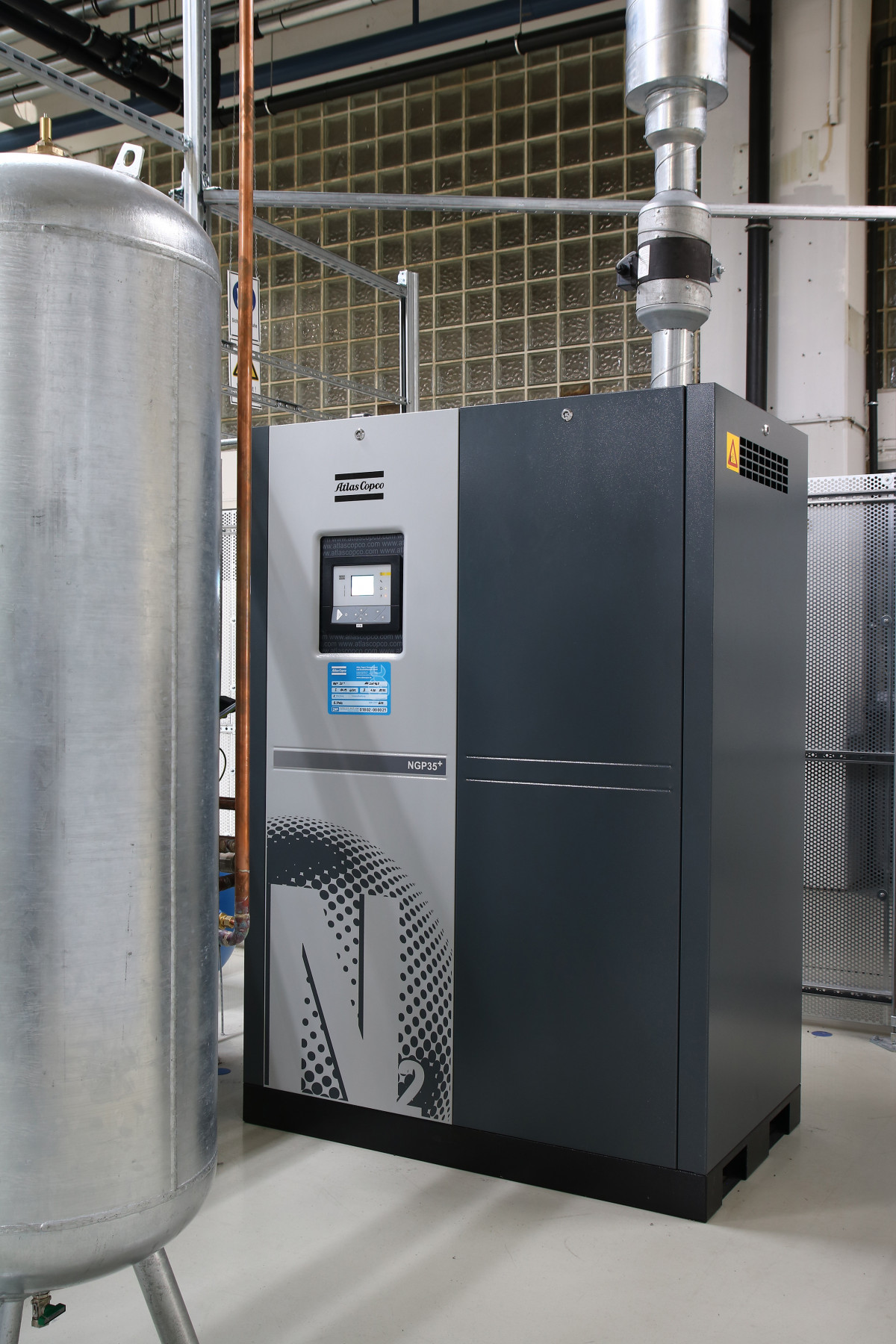 Anfragen bei mehreren Anbietern mündeten in der Investition in eine komplette Stickstoffstation von Atlas Copco, die sich binnen 2,25 Jahren amortisieren sollte. „Atlas Copco konnte alles aus einer Hand liefern“, erklärt Merz. „Das war ein wichtiges Argument für uns. Andere Anbieter müssen entweder den Kompressor oder den Stickstoffgenerator zukaufen.“ Denn die Basiselemente einer autarken Stickstofferzeugung sind ein Kompressor, der die Umgebungsluft verdichtet, und ein Stickstoffgenerator, der aus der erzeugten Druckluft den Sauerstoff abscheidet und den Stickstoff auf die gewünschte Reinheit anreichert.