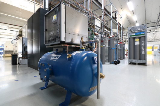 Der GA-Kompressor liefert Druckluft mit 9,7 bar, die in einem 500-Liter-Behälter zwischengespeichert wird. Der Kessel versorgt den NGP 35+, der den Stickstoff zunächst aus der Luft abscheidet und dann in einem Kreislauf über einen Reinhaltetank auf die geforderte Reinheit von 99,9992 Prozent anreichert. Die Stickstoffqualität liegt damit bei 5.0.