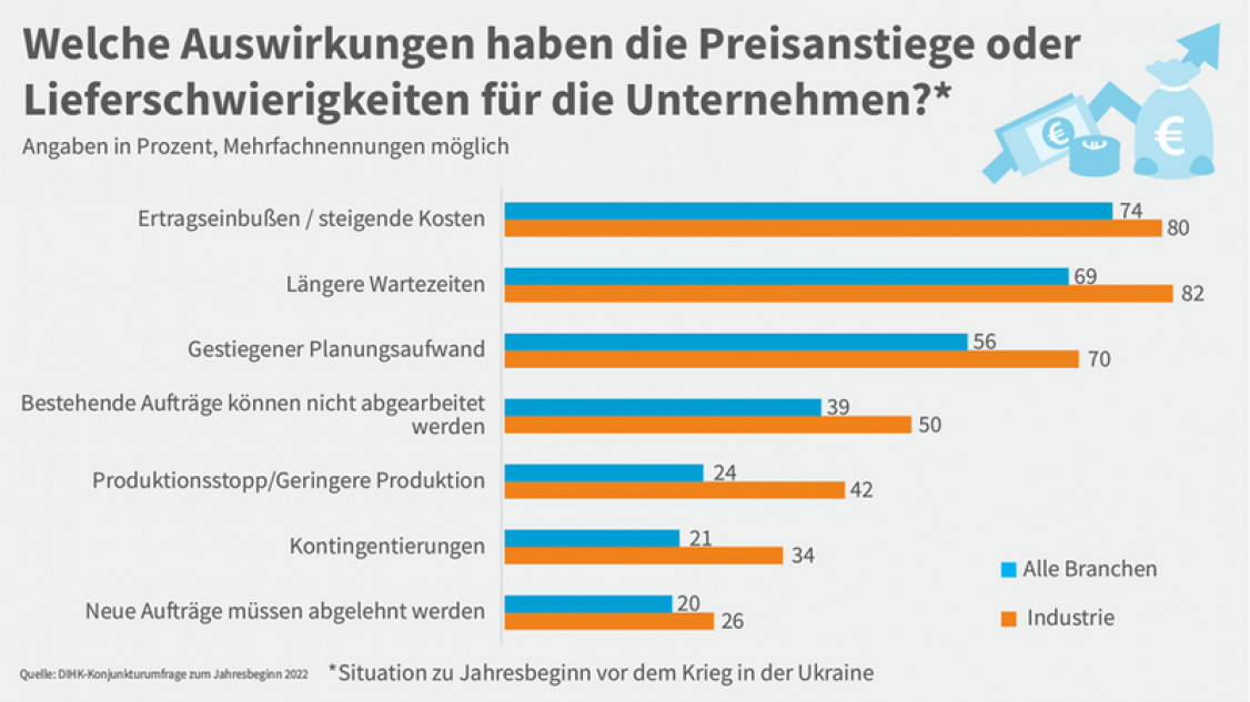 Schon in der bundesweiten IHK-Konjunkturumfrage zu Jahresbeginn hätten 84 Prozent der deutschen Industriebetriebe mittlere bis erhebliche Lieferschwierigkeiten gemeldet, teilten DIHK-Vizepräsident Ralf Stoffels und DIHK-Außenwirtschaftschef Volker Treier am 17. März vor Journalisten mit. Damit sei bereits vor Kriegsausbruch eine deutliche Mehrheit der Unternehmen mit Problemen in ihren Lieferketten konfrontiert gewesen.