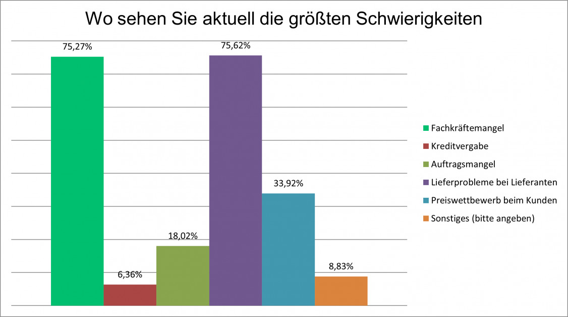Laut einer aktuellen Konjunkturumfrage des Bundesverbandes Metall gaben über 75 Prozent der Metallhandwerksbetriebe an, dass zusätzlich zum Fachkräftemangel die Lieferkettenprobleme derzeit erhebliche Schwierigkeiten bereiten. Für die nahe Zukunft erwarten zwei Drittel der Betriebe des Metallhandwerks Stagnation, jedes fünfte Unternehmen rechnet mit einer Eintrübung der wirtschaftlichen Lage, lediglich 13 Prozent der Betriebe sind optimistisch bzgl. ihrer Erwartungen.