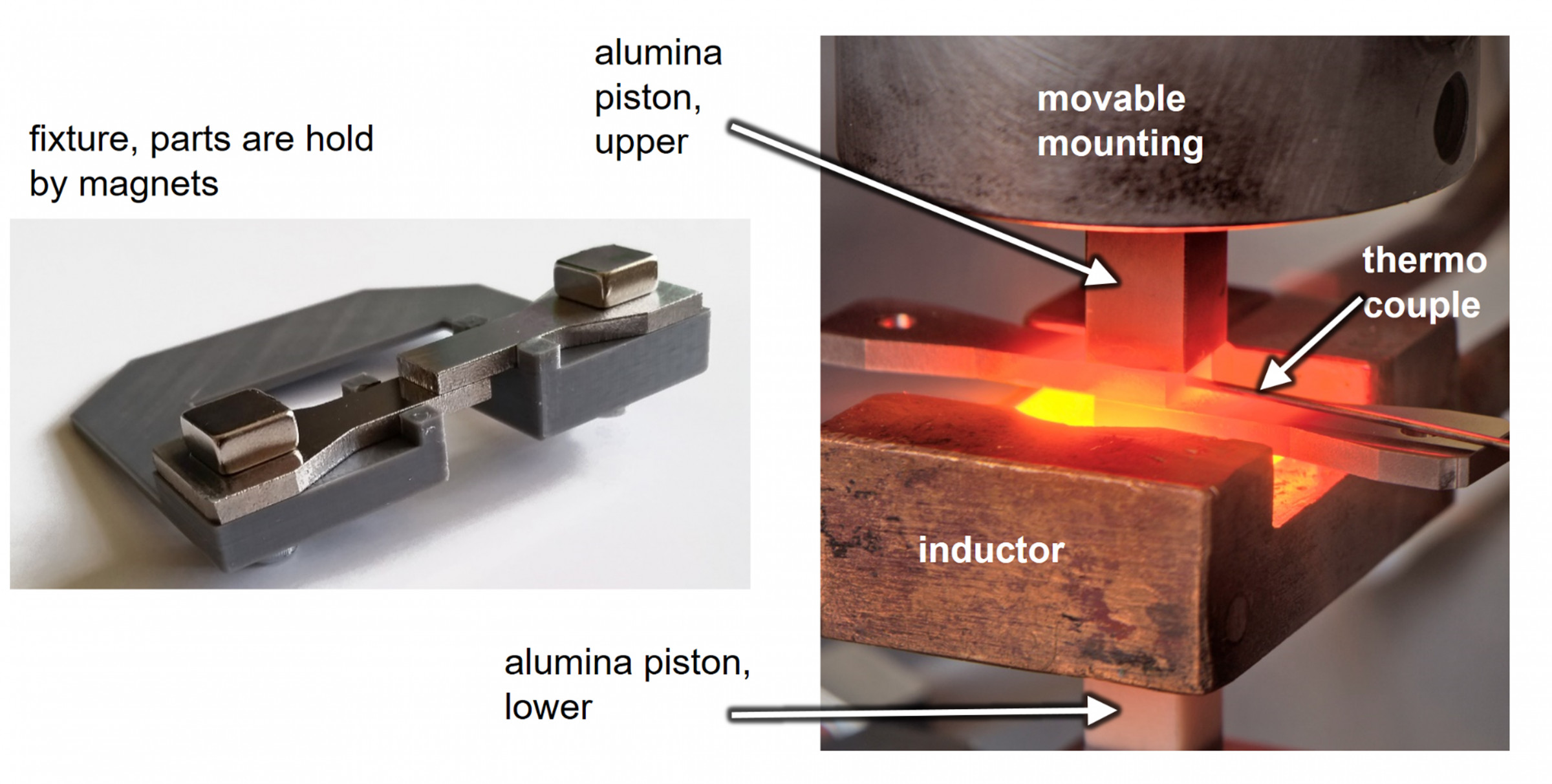 For the joining process, two individual parts of a base material, each coated with a layer of pre-dried nanopaste, were placed in a specialized fixture. The sample arrangement was then inserted into the chamber which is able to operate under high vacuum at pressures below 4 × 10⁻⁴ mbar to avoid any adverse effects from air during the joining process. Holders made of Al₂O₃, one of which axially movable to apply pressure on the sample’s overlapping section from the outside, keep the sample in a fixed position so that the fixture can be removed before joining. On the end of one sample is a drill hole, into which a thermocouple is inserted to control the process temperature. After generating vacuum, the sample material was heated inductively at a heating rate of 150 K/min up to the specified temperature, according to the design of experiments (Table 2). After the holding time ended, the sample cooled down freely. The whole experimental setup is shown in Fig. 3 and 4.