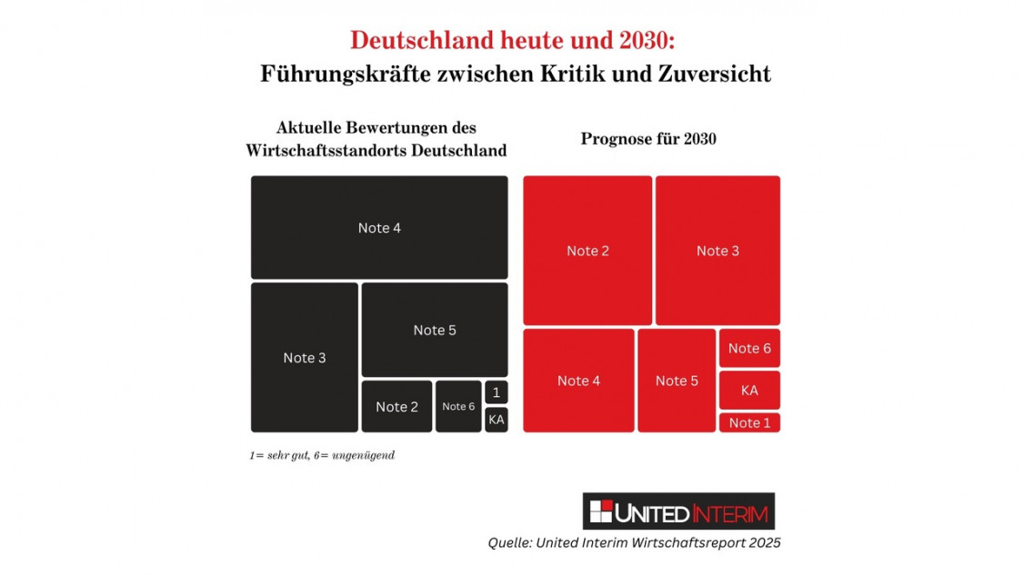 Die deutsche Wirtschaft muss sich auf eine länger anhaltende Rezession einstellen, die nur durch grundlegende Reformen zu bewältigen sein wird. Zu diesem Schluss gelangt der „Wirtschaftsreport 2025“ der Management-Community United Interim. Dem Report liegt eine Umfrage unter 550 Interim Managern zugrunde; diese gelten als „Seismografen der Wirtschaft“. Studienleiter Dr. Harald Schönfeld, Geschäftsführer von United Interim, begründet: „Interim Manager übernehmen als Führungskräfte auf Zeit in mehr Unternehmen mehr betriebliche Aufgaben als angestellte Manager und erhalten dadurch einen übergreifenden Einblick in die aktuellen Herausforderungen der Wirtschaft.“ Zehn der renommiertesten Interim Manager – Dr. Bodo Antonić, Ulvi Aydin, Ulf Camehn, Ruben Faust, Christian Florschütz, Eckhart Hilgenstock, Jane Enny van Lambalgen, Klaus-Peter Stöppler, Roland Streibich und Karlheinz Zuerl – haben die Wirtschaftsumfrage konzipiert und die Ergebnisse analysiert.