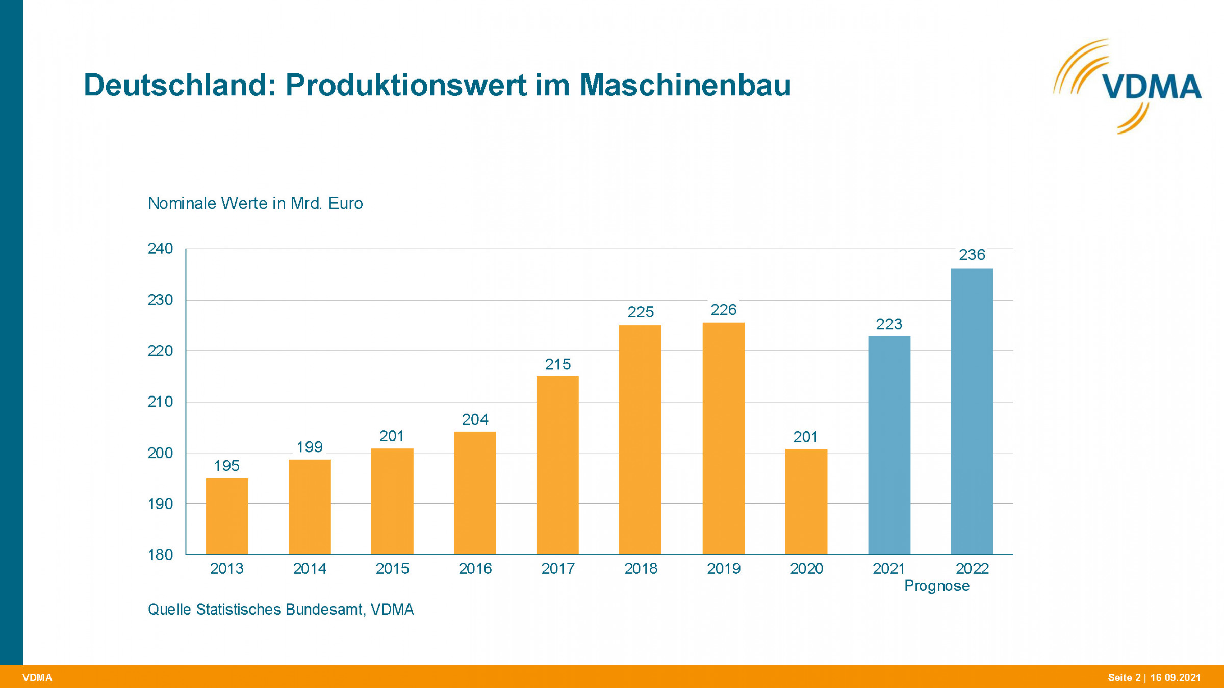 Die Auftragsbücher im Maschinen- und Anlagenbau haben sich gut gefüllt, zugleich kämpfen viele Unternehmen mit zunehmenden Material- und Lieferengpässen. Drastisch zugenommen haben insbesondere Knappheiten von elektrotechnischen und Elektronikkomponenten. Die VDMA-Volkswirte bekräftigen ihre Produktionsprognose von plus 10 Prozent für das laufende Jahr, für 2022 rechnen sie mit einem Produktionsplus von 5 Prozent.