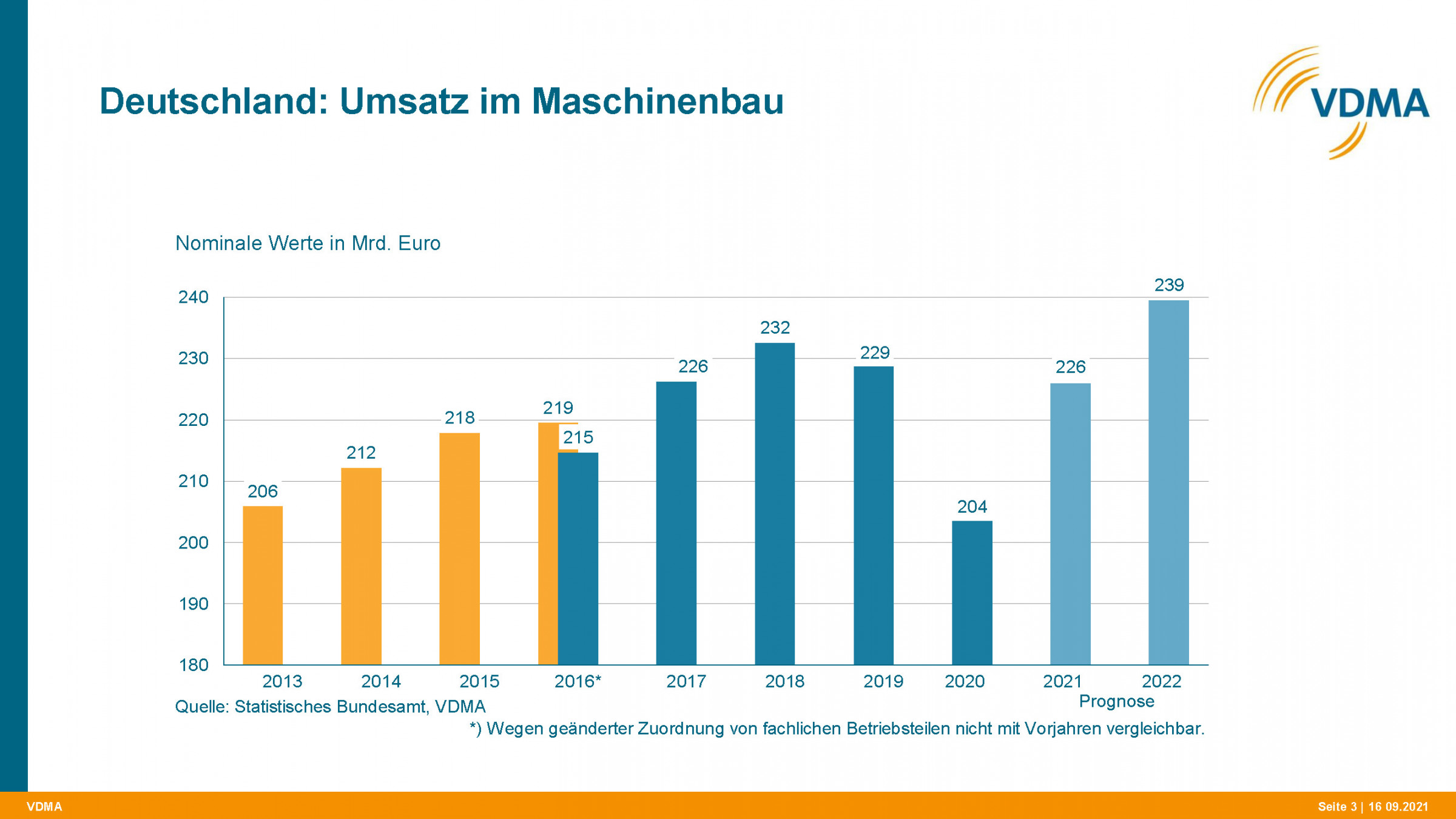In den ersten sieben Monaten des laufenden Jahres verzeichnete der Maschinen- und Anlagenbau ein reales Produktionsplus von 7,1 Prozent zum Vorjahr. Noch kräftiger legten die Auftragseingänge von Januar bis einschließlich Juli zu, sie stiegen um 30 Prozent zum Vorjahr (Inland: plus 20 Prozent, Ausland: plus 36 Prozent). Das wird in den kommenden Monaten nach Einschätzung der VDMA-Volkswirte für eine weiterhin hohe Kapazitätsauslastung sowie Produktionszuwächse sorgen. Für das Gesamtjahr 2021 bleiben die VDMA-Volkswirte bei ihrer Einschätzung eines Wachstums von 10 Prozent. Damit würde die Branche ihrem Produktionswert von 2019 zwar ein gutes Stück nähergekommen. Zwischenzeitliche Hoffnungen auf ein noch höheres Wachstum werden sich aller Voraussicht nach aber nicht erfüllen. In einigen Fachzweigen, speziell bei den Herstellern von Teilen und Komponenten, sowie in Asien gibt es erste Anzeichen für ein geringeres Expansionstempo. „Andere kommen jetzt erst richtig in Schwung, müssen aber wegen der zahlreichen Engpässe Abstriche bei ihren Produktionsplänen machen“, schränkt Wiechers ein.
