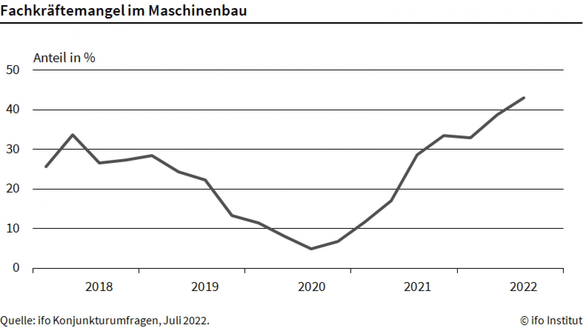 Der deutsche Maschinenbau leidet unter zunehmendem Fachkräftemangel. Das meldeten in der Juli-Umfrage des ifo Instituts 43,0 Prozent der befragten Unternehmen der Branche, nach 38,7 Prozent im April. „Die Maschinenbauer spüren jetzt die Folgen des Personalabbaus vor und während der Corona-Pandemie“, sagt Nicolas Bunde, Branchenexperte am ifo Institut. „Jetzt suchen die Betriebe händeringend geeignetes Personal.“