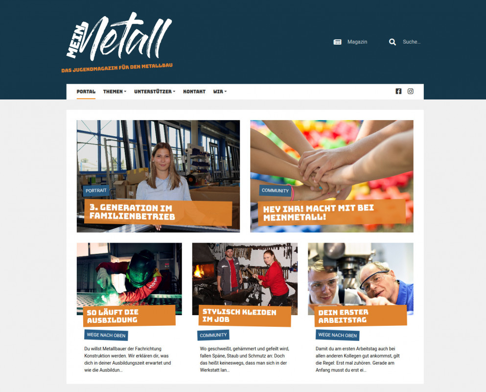 MEINMetall soll Jugendlichen zeigen, welche beruflichen Perspektiven und Möglichkeiten zur Weiter- und Fortbildung der Metallbau bietet und welche persönlichen Erfolgsgeschichten und herausragenden Projekte von jungen Metallern gestaltet werden. In spannenden Reportagen und Portraits wird von Gründergeschichten und Erfolgsstorys berichte und das abstrakte Berufsbild auf einer persönliche und emotionaler Ebene erzählt. Sprachlich und grafisch an der Zielgruppe orientiert und mit Links zu digitalen Inhalten.