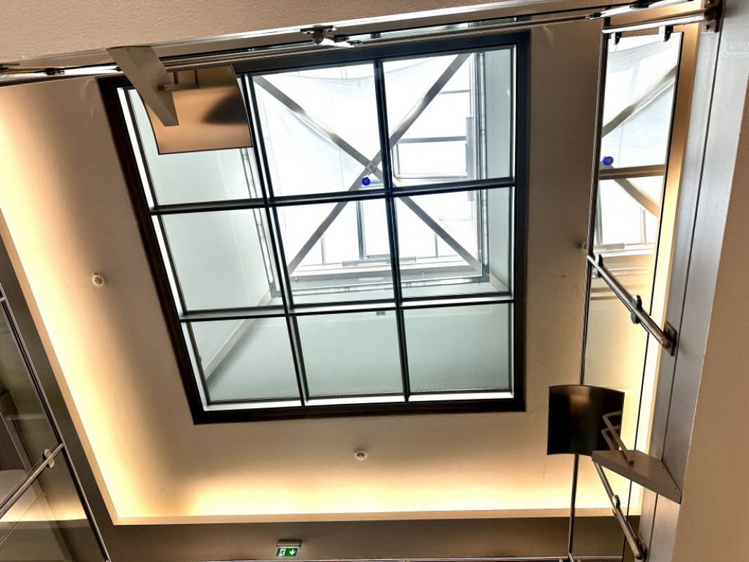 Zu den Arbeitsplätzen im Gebäude eines Finanzdienstleisters gelangt seit kurzem das Tageslicht auch durch die Glastrennwände im Inneren des Gebäudes. Die neue Glasdecke des Atriums, die zugleich der begehbare Glasboden für das als Seminarraum genutzte Dachgeschoss über dem Atrium ist, musste statisch belastbar in die Öffnung eingesetzt und im laufenden Betrieb in das Gebäude eingebracht werden.