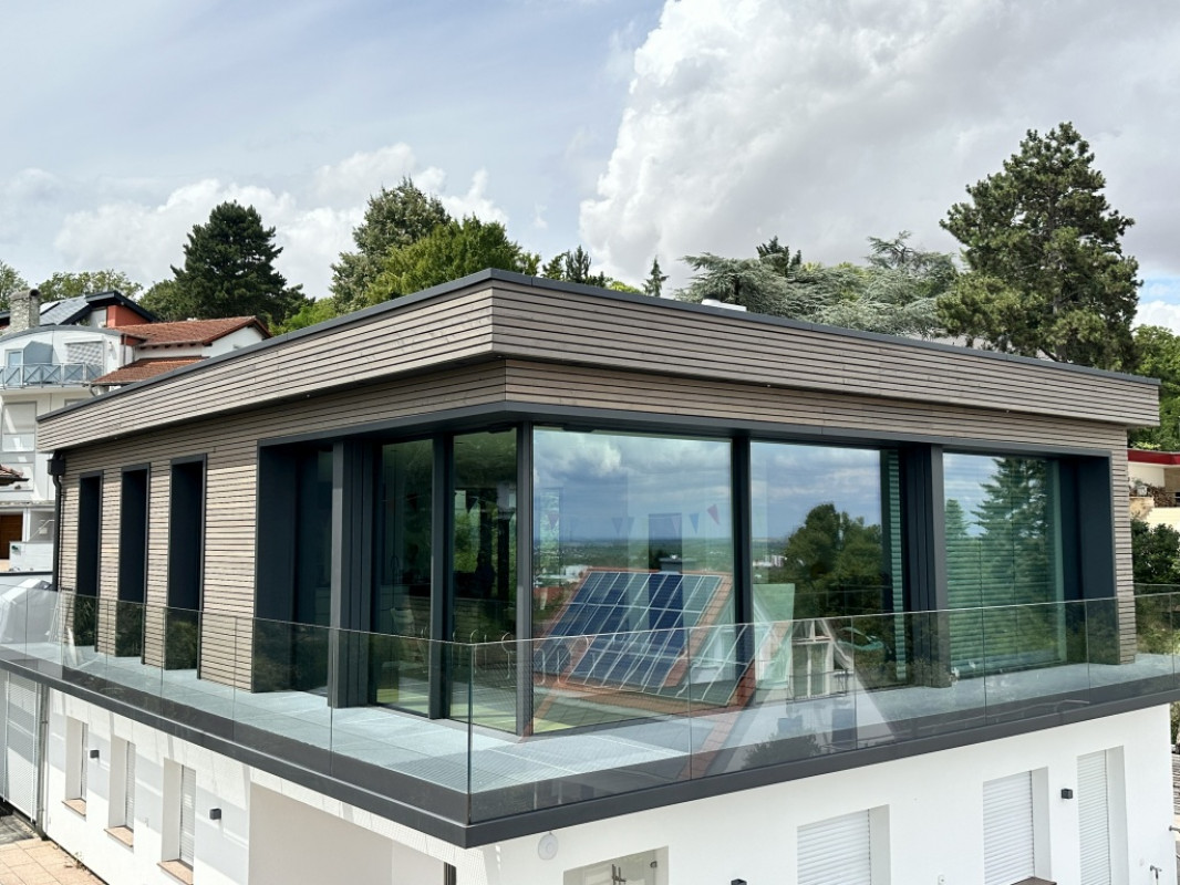 Ein Haus mit Panoramablick wurde aufgestockt und erhielt zwei Glasfensterfronten, die sich über Eck weit öffnen lassen. Die Eckstulp-Schiebe-Anlage der Firma AKV Metallbau aus Mannheim zeigt eindrucksvoll, wie eine solche einmalige Aussicht verwirklicht werden kann, und gewinnt damit verdient den Deutschen Metallbaupreis in der Kategorie Türen.