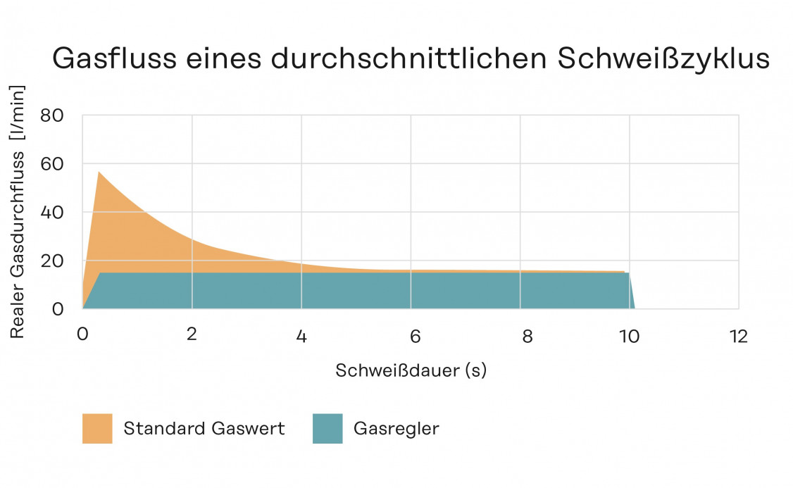 Der Vergleich eines herkömmlichen Gas-Magnetventils zum Gasregler verdeutlicht den Unterschied. Wird beispielsweise ein Gasfluss von 18 l/min benötigt, baut der Gasregler diesen unmittelbar auf und hält ihn konstant. Mit einem Gas-Magnetventil hingegen steigt der Gasfluss für kurze Zeit bis zu 55 l/min an und regelt sich dann erst auf die eingestellte, tatsächlich benötigte Menge herunter. Der Unterschied im Verbrauch zeigt sich bei jedem Schweißstart – je mehr und je kürzer die Nähte, desto höher die Einsparungen in der Produktion.