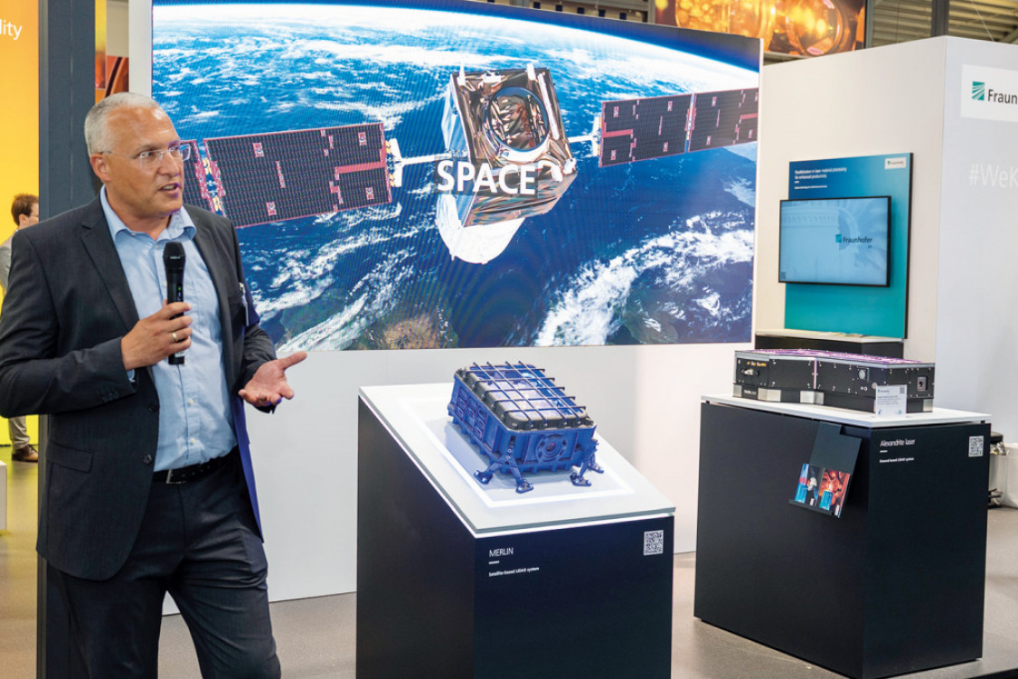 Expertinnen und Experten des Fraunhofer ILT setzen den Laser bereits seit mehreren Jahren für die Klimaforschung ein. LIDAR-Systeme (Light Detection and Ranging), eine Form des dreidimensionalen Laserscannings, ähnlich dem Radar, leisten dabei einen wichtigen Beitrag. Es gibt erdgebundene, helikopter- oder satellitengestützte Systeme. Auf der LASER World of PHOTONICS wurden Exponate zu diesen drei verschiedenen Varianten präsentiert. Eine davon ist das satellitengestützte LIDAR-System der deutsch-französischen Klimamission MERLIN (Methane Remote Sensing LIDAR-Mission).