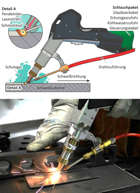 Auf Messen und Fachveranstaltungen rund um Innovationen in der Schweißtechnik steht das handgeführte Laserstrahlschweißen häufig im Zentrum des Interesses. Beim handgeführten Laserstrahlschweißen wird ein Laserstrahl durch ein Lichtleiterkabel zu einer Schweißpistole mit integrierter Optik geführt. Je nach Geräteausführung kann die Optik den Laserstrahl ein- oder zweidimensional pendeln lassen. Die Laserleistung liegt typischerweise zwischen 1 und 2 kW [1]. Durch eine optionale Drahtzuführung kann zwischen Schweißungen mit und ohne Zusatzdraht gewechselt werden. Dabei sorgt der Zusatzdraht für einen Rückstoß an der Schweißpistole und gibt damit die Schweißgeschwindigkeit vor. Diese Teilautomatisierung erlaubt eine sehr kurze Einarbeitungszeit, um Nähte mit hoher Qualität schweißen zu können. Das ist gerade mit Blick auf den Fachkräftemangel ein großer Vorteil für Unternehmen. Die Schweißrichtung ist immer schleppend, wobei in der Regel in Wannenposition oder am Eckstoß geschweißt wird. Bild 1 stellt den Prozess schematisch und in der praktischen Anwendung dar.
