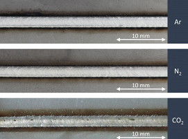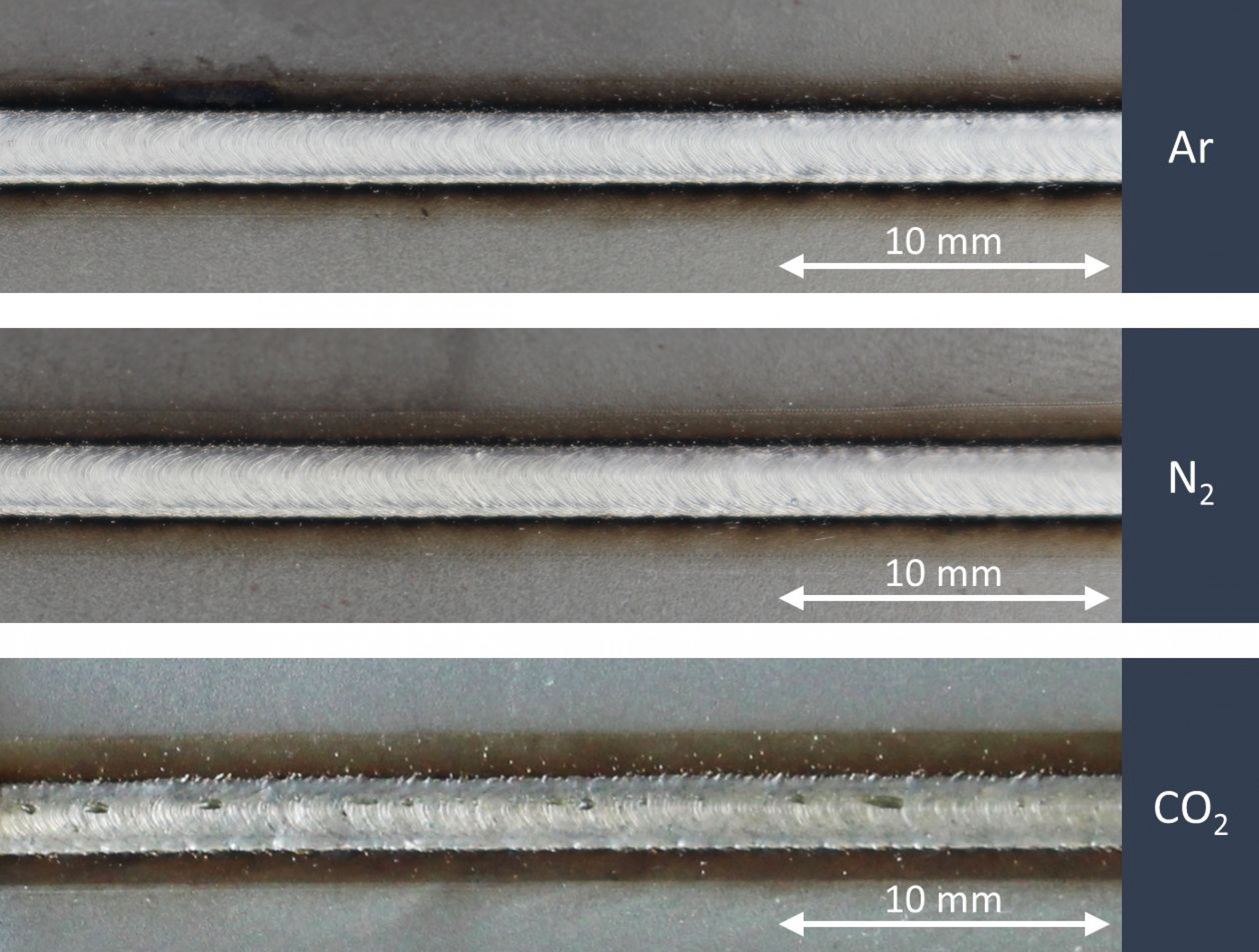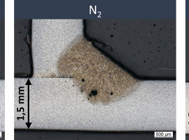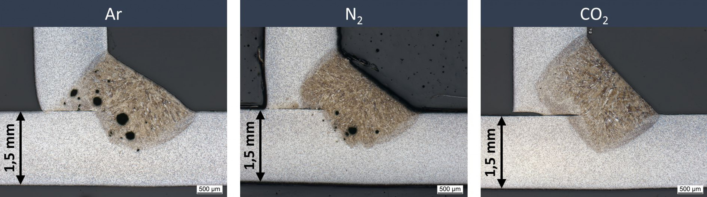 Ein Auszug aus der Forschungsarbeit am Fraunhofer IPK zeigt den Vergleich von Schweißungen mit den typischen Schutzgasen Argon (Ar), Stickstoff (N2) und Kohlenstoffdioxid (CO2) an T-Stößen von HX340LAD mit einer Blechdicke von 1,5 mm. Bis auf das Schutzgas sind die Schweißparameter dabei gleichgeblieben. Die Gasdurchflussmenge wurde auf 14 l/min geregelt. Von außen zeigen die handgeführten Laserstrahlschweißungen jeweils sehr hohe Nahtqualitäten (Bild 2). Der Rückstoß des Zusatzdrahts der Güte SG3 führt zu einer gleichmäßigen Schweißgeschwindigkeit von 80 cm/min bei gleichbleibender Schuppung der Naht. Lediglich bei Verwendung von CO2 als Schutzgas treten einzelne Spritzer auf. Die Porosität von laserstrahlgeschweißten Nähten an Stahl wird gemäß DIN EN ISO 13919-1 analysiert und in Qualitätsklassen eingeteilt. Hierfür eignen sich Durchstrahlungsprüfungen wie Röntgen oder auch mehrere Querschliffe entlang der Schweißnaht. Die Porosität wird anschließend ausgerechnet als Anteil der Poren im Verhältnis zu der aufgeschmolzenen Fläche. Um die Aussagekraft der Querschliffe zu erhöhen, können auch mehrere Schliffe je Schweißnaht angefertigt werden. Ausschlaggebend für die Bewertung anhand der Gruppen aus der Norm ist jeweils die schlechteste Messung. Für diese geschweißten T-Stöße wurden je Schweißung drei Querschliffe angefertigt Der jeweils mittlere ist in Bild 3 dargestellt. Mit Argon als Schutzgas wird mit einer maximalen Porosität von 4,43 % lediglich Bewertungsgruppe D der entsprechenden Norm erreicht. Auch zeigen sich deutliche Poren mit einem maximalen Durchmesser von 0,25 mm. Wird hingegen Stickstoff verwendet, kann eine maximale Porosität von 1,35 % und damit die beste Gruppe B erreicht werden. Auch der maximale Porendurchmesser sinkt auf 0,17 mm. Bei Kohlenstoffdioxid sinkt die Porosität noch weiter auf einen Maximalwert von 0,14 % bei einem maximalen Durchmesser von 0,08 mm. Damit entspricht auch diese Schweißung der Bewertungsgruppe B. Gleichzeitig verringert sich jedoch auch die Einschweißtiefe etwas, weshalb je nach gewünschter Anbindung die Laserleistung erhöht werden sollte.
