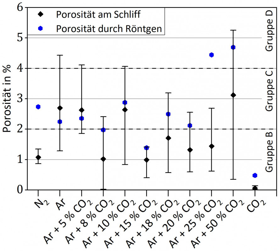 Neben den drei einzelnen Schutzgasen wurden auch verschiedene Mischgase aus Argon und CO2 getestet, die im Lichtbogenschweißen häufg Anwendung finden. Wieder wurden je Schweißung drei Querschliffe genommen. Um einen besseren Eindruck über die gesamte Nahtlänge zu bekommen, wurden außerdem Röntgenprüfungen durchgeführt. Das Ergebnis der Gegenüberstellung ist in Bild 4 zu sehen, mit einer Markierung für die Bewertungsgruppen entsprechend DIN EN ISO 13919-1. Dabei werden die Fehlerbalken durch das Maximum oder Minimum der drei Schliffe je Schweißung gebildet. Es zeigt sich, dass die Querschliffe zu Stickstoff eine bessere Bewertungsgruppe ergeben als die Röntgenaufnahme. Dies ist typisch, da ein Schliff immer nur eine Momentaufnahme darstellt. Für Argon liegt die Röntgenaufnahme innerhalb des Streubands aus den drei Querschliffen, wobei der schlechteste mit einer Qualität der Gruppe D die Nahtqualität bestimmt. Die Gasmischungen aus Argon und CO2 liefern nur bei einer Beimischung von 15 % CO2 die bessere Bewertungsgruppe B. Das reine CO2 schneidet weiterhin am besten ab, mit sehr geringer Porosität im Querschliff bei einem Wert unter 1 % auch in der Röntgenaufnahme. Dieser Effekt lässt sich dadurch erklären, dass reines CO2 als reaktive Komponente wirkt und eine schwach oxidierende Reaktion mit dem Schmelzbad eingeht. Die resultierende Oxidation führt lokal zu einer Reduzierung der Oberflächenspannung der Schmelze. Eine verringerte Oberflächenspannung begünstigt die Ausbildung eines flacheren und breiteren Schmelzbades, verbessert das Fließverhalten und unterstützt dadurch eine effektivere Entgasung des Schmelzbades. Für niedriglegierten Stahl sollte somit der Einsatz von CO2 als Schutzgas im handgeführten Laserstrahlschweißen erwogen werden. Etwas erhöhte Spritzerbildung und geringe Oxidation der Schweißnahtoberfläche sind jedoch hinzunehmen. Gegebenenfalls sollte eine moderate Erhöhung der Laserleistung vorgenommen werden, um eine ausreichende Aufschmelzung des Werkstoffs weiterhin sicherzustellen. Das deutlich günstigere CO2 bietet Anwendern somit weitere Kostenersparnisse zusätzlich zur hohen Produktivität des handgeführten Laserstrahlschweißens.