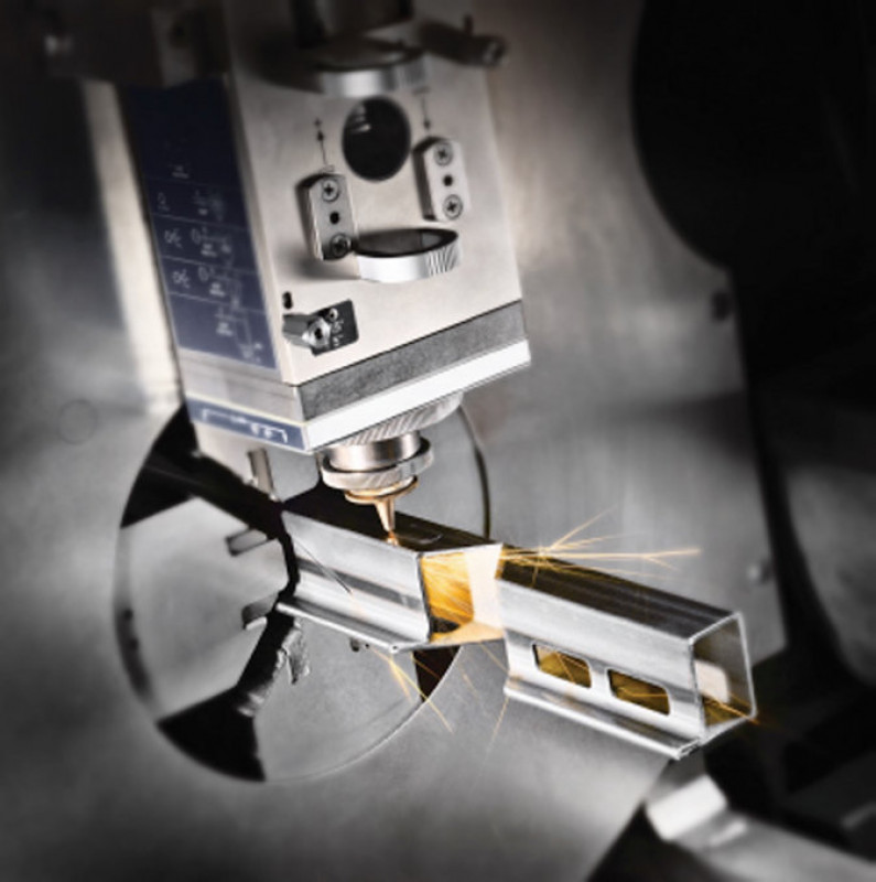Ein weiteres Bearbeitungsverfahren zeigt ebenso seine Stärke bei Produktivität und Flexibilität: das Laserstrahlschneiden von Rohren. Wegen der freien Programmierbarkeit des Rohrlasers können ganz verschiedene Strukturen und Geometrien geschnitten werden. Die Maschine schafft nicht nur Kappschnitte und Bohrungen, sondern erzeugt nahezu alle geometrisch darstellbaren Geometrien wie Langlöcher, Ausbrüche, Steckverbindungen, Hakenstrukturen, Sechskantausschnitte usw.