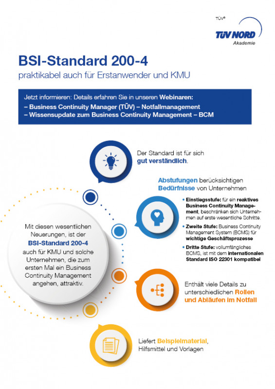 „Der Druck durch Cyber-Angriffe nimmt auch für kleinere und mittlere Unternehmen zu, so dass sie sich für den Notfall rüsten müssen, auch wenn die Kapazitäten knapp sind. Mit dem modernisierten BSI-Standard 200-4 erhalten neu einsteigende Organisationen klare Hilfestellungen für den stufenweisen Aufbau eines Notfallmanagements, gut verständliche Vorlagen, Details zu Rollen und Abläufen ebenso wie Anwendungsbeispiele für den Arbeitsalltag“, erläutert Prof. Christoph Thiel, Informationssicherheitsexperte an der FH Bielefeld und Referent der TÜV NORD Akademie.