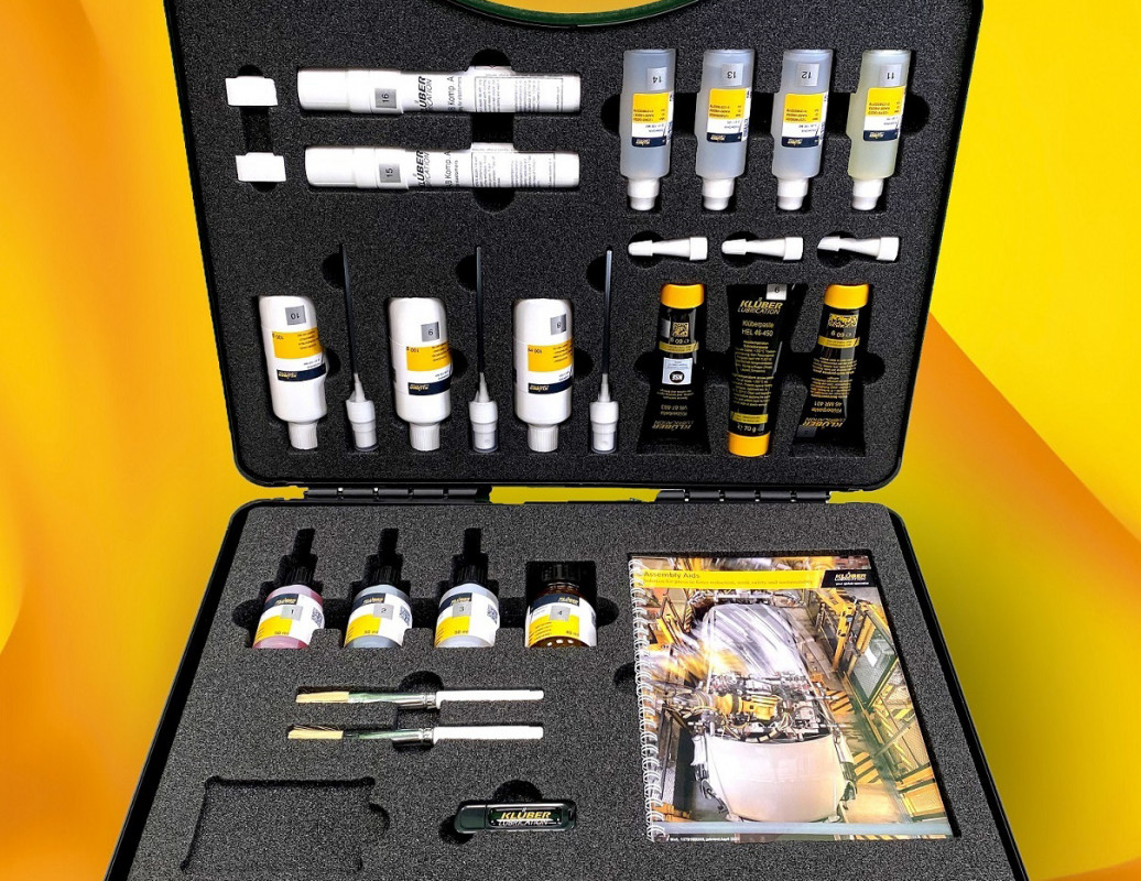 Untergebracht ist das Schmierstoffsortiment des Assembly-Aid Kit in einem kompakten, widerstandsfähigen Koffer, der zu 90 Prozent aus biologisch abbaubarem Zuckerrohr besteht.