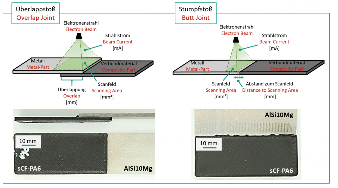 The production of new metal-polymer multi-materials is a major challenge due to the difficulty of achieving a strong bond between dissimilar materials, resulting from their different physical and chemical properties. However, Fraunhofer IPK has developed a novel method Electron Beam Bonding to overcome this challenge using the innovative thermal joining technologies of the electron beam process. In this method, the thermal energy is applied uniformly to a defined scanning area on the surface of the metal part using electron beams to achieve the heat input required for the composite melting temperature. Heat transfer through direct contact between the composite material and the metal part causes localized melting of the composite, resulting in adhesion to the metal part. Electron Beam Bonding offers several advantages, including the ability to join in a vacuum chamber, which prevents the formation of oxide layers on metal parts or gas bubbles in composite parts. Furthermore, due to the flexibility of the electron beam movement and the ability to adjust the electron beam deflection make Electron Beam Bonding suitable for all geometric shapes and joint types, such as lap, butt, corner and T-joints.
