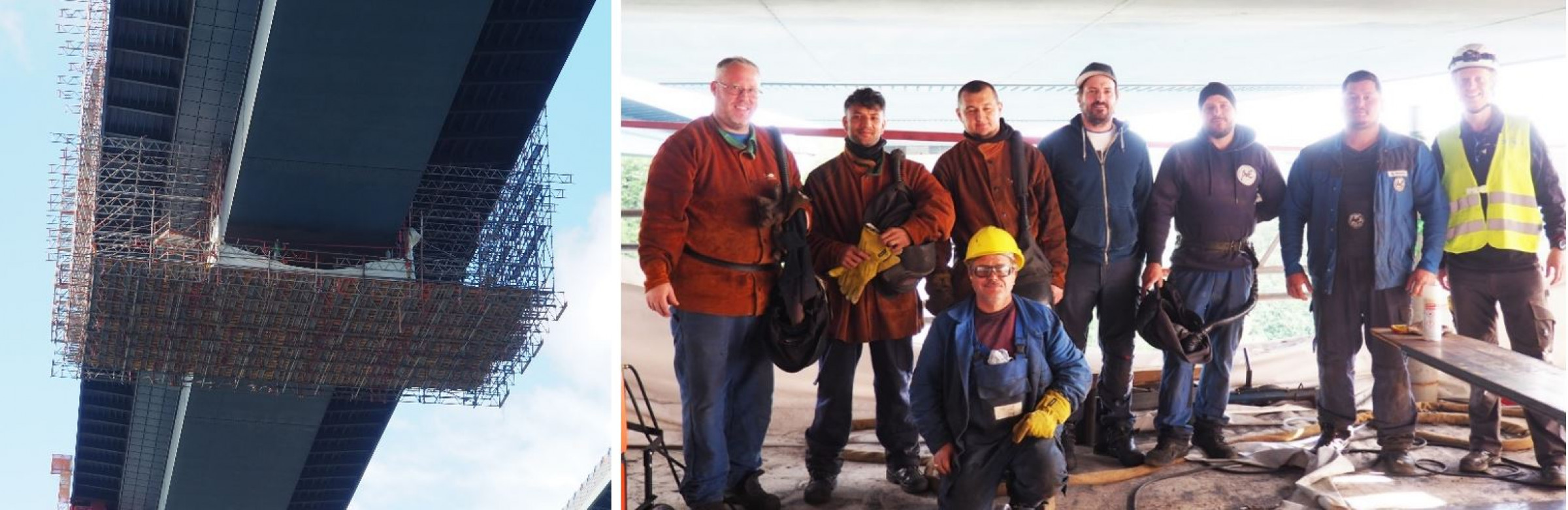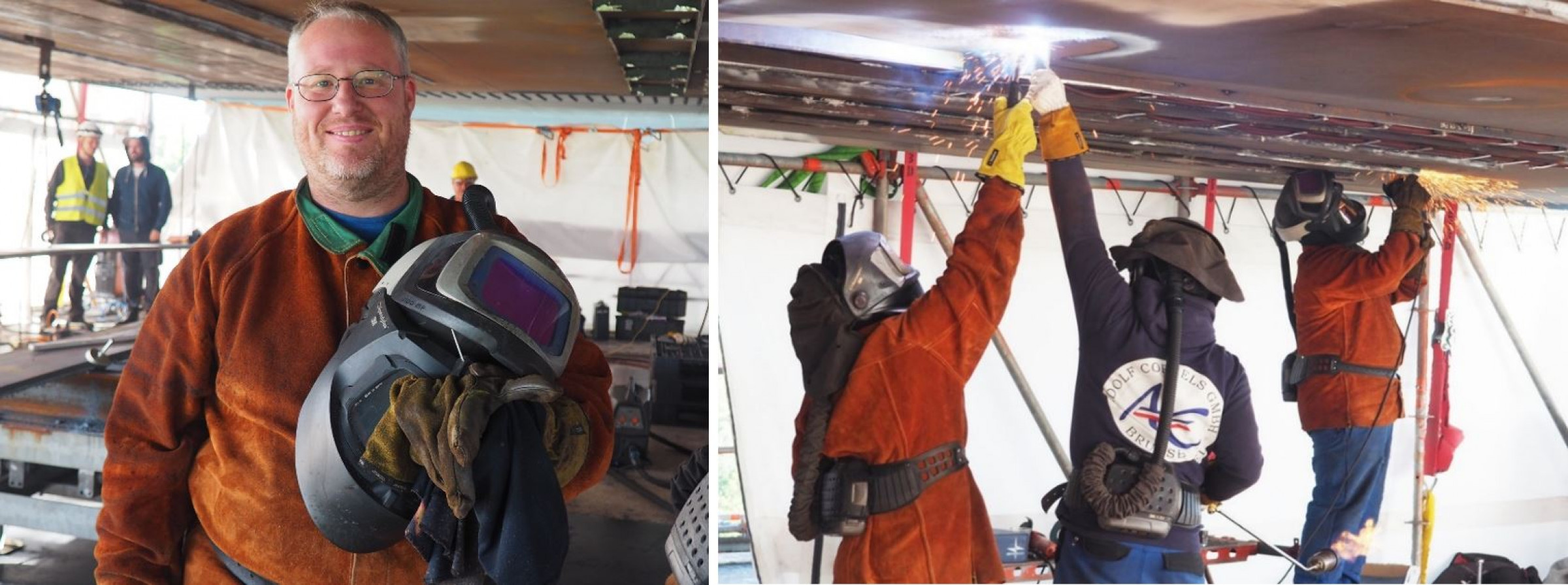 Die Arbeit hoch über dem Nord-Ostsee-Kanal bringt dabei noch eine weitere Herausforderung mit sich – den Schiffsverkehr. Jedesmal, wenn ein Schiff unter ihnen die Brücke passiert, müssen die Schweißer ihre Arbeit unterbrechen, damit dieses nicht von herabfallenden Funken getroffen werden kann. Nahen hohe Schiffe, könnte es sogar zur Kollision dieser mit dem Baugerüst kommen. Schiffe, die mehr als 36 m hoch sind, dürfen daher inzwischen nur noch nachts und an den Wochenenden unter der Brücke hindurchfahren, „Zum Glück wurde diese Regelung getroffen“, erinnert sich Schweißfachingenieur Michael Thomeßen, der die Arbeiten als externe Schweißaufsicht begleitet. „Denn zuerst war geplant, das gesamte über 30 Tonnen schwere Hängegerüst bei jedem nahenden großen Schiff aufwändig auf Schienen zur Seite zu fahren. Etwa sechs Stunden hätte es dann gedauert, bis die Konstruktion wieder an ihrem Platz gewesen wäre und die Arbeit hätte weitergehen können.“