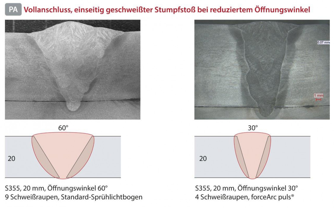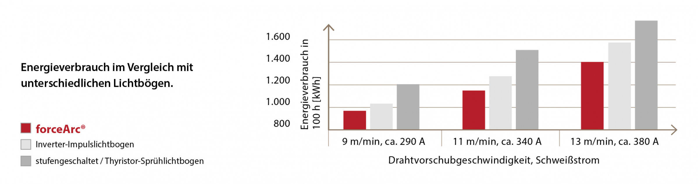 Um in der Schweißtechnik Energie, also Strom, einzusparen, ist die Technologie mitentscheidend. So wandelt die moderne Invertertechnologie im Vergleich zu analogen stufengeschalteten Transformator-Stromquellen die eingesetzte Energie mit einem deutlich geringeren Verlust in einen dem jeweiligen Prozess angepassten Strom um. Noch wesentlicher sind die innovativen Schweißprozesse. Jeder einzelne Schweißprozess ist optimal auf den jeweiligen Anwendungsfall ausgelegt und bringt die eingesetzte Energie in der optimalen Menge und Form in die Schweißnaht ein. So arbeitet ein coldArc-Lichtbogen zum Beispiel mit weniger Wärmeeinbringung als ein Kurzlichtbogen. Als Folge dieser Energieersparnis reduzieren sich der Verzug und damit die Nacharbeit. forceArc puls dagegen ist ein wärmeminimierter, richtungsstabiler, druckvoller Lichtbogen mit tiefem Einbrand. Er schiebt selbst den Zunder von unbehandeltem Schwarzstahl vor sich her. Das Ergebnis sind qualitativ hochwertige, spritzerfreie Schweißnähte. Dadurch werden Arbeiten bei der Schweißnahtvorbereitung und der Nacharbeit eingespart und damit zweifach Energie: Strom und menschliche Kraft. Zeit- und Materialeinsparungen kommen dazu.