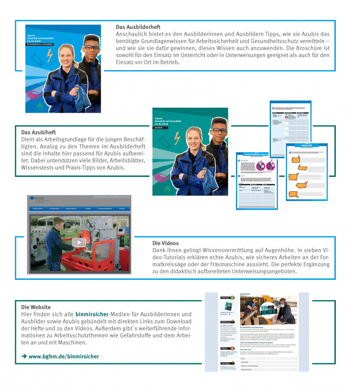 Die BGHM hat dazu das Angebot mit dem Motto „binmirsicher“ für ihre Mitgliedsbetriebe entwickelt. Es besteht aus zwei Broschüren und verschiedenen Video-Tutorials. Anschaulich und zielgruppengerecht bietet das Heft für Ausbilderinnen und Ausbilder den Verantwortlichen Tipps, wie sie ihren jungen Schützlingen das benötigte Grundlagenwissen für Arbeitssicherheit und Gesundheitsschutz vermitteln – und wie sie sie dafür gewinnen, dieses Wissen auch anzuwenden. Die Broschüre ist sowohl für den Einsatz im Unterricht oder in Unterweisungen geeignet als auch für den Einsatz vor Ort im Betrieb.