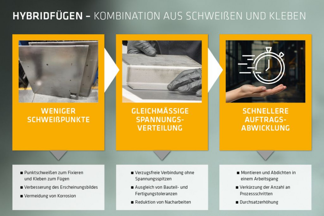 Die Ergänzung der Klebetechnik im Fügeprozess von Metallen ist eine vielversprechende Variante, um die aktuellen Herausforderungen der metallverarbeitenden Betriebe meistern zu können. Die Klebetechnik in Kombination mit dem Schweißen bietet hierfür vielfältige Möglichkeiten sowie ein hohes Maß an Gestaltungsfreiheit, damit sowohl kleine Handwerksbetriebe als auch Industriekonzerne einen echten Mehrwert für deren Unternehmen, Beschäftigte und Kundenkreise generieren können. Die Sika Deutschland GmbH ermöglicht mit leicht umsetzbaren Lösungen einen schnellen und einfachen Zugang zum Kleben von Metallen und erleichtert erste Praxiserfahrungen.
