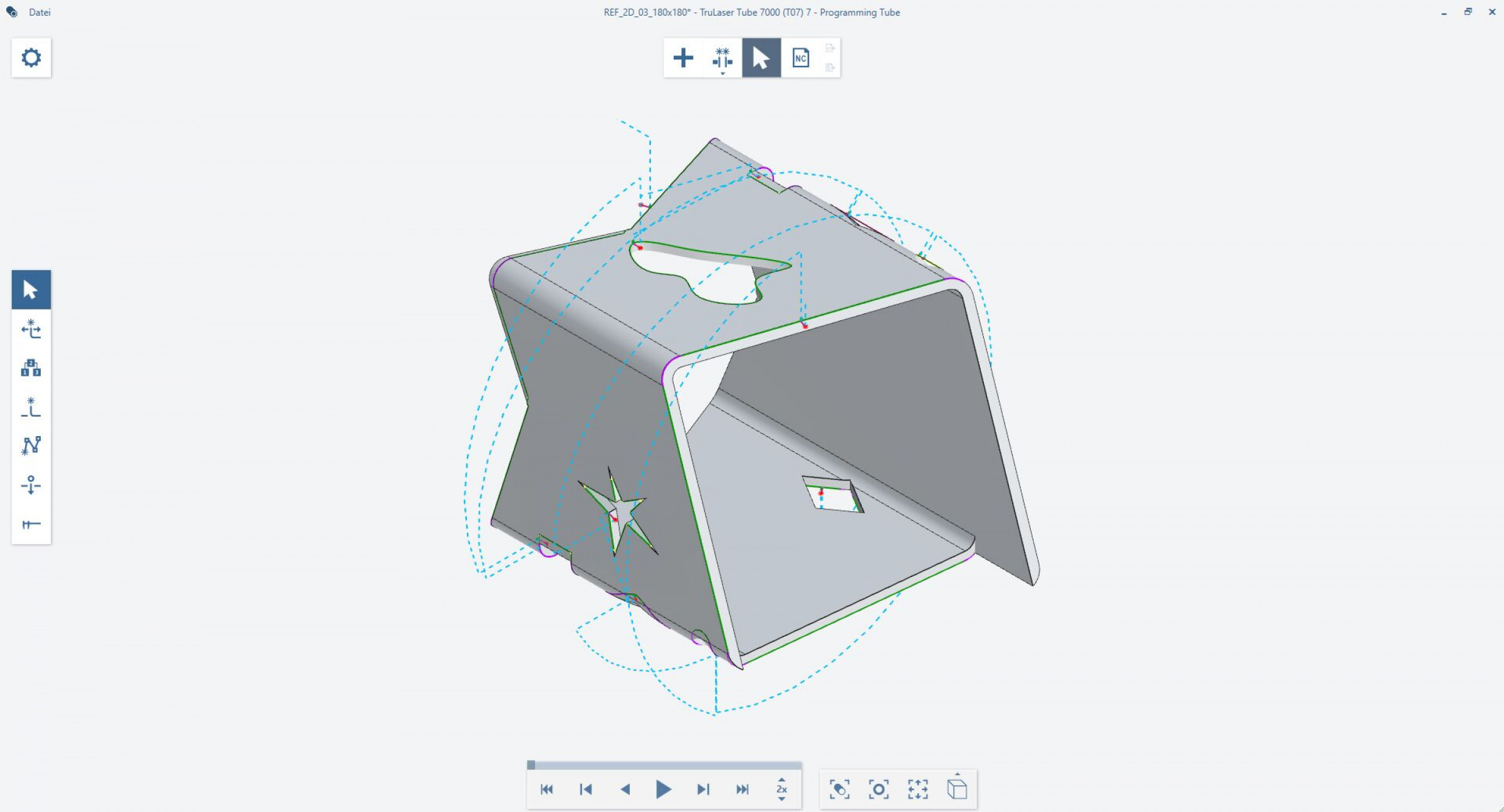 In Programming Tube lässt sich komplett in 3D programmieren – und das extrem schnell. Im Anschluss an die Konstruktion erledigt die Software den Programmiervorgang automatisch. Sie erleichtert die Arbeit des Programmierers, denn sie legt auch selbstständig fest, wie die Laser-Rohrschneidmaschine Teile ausschleusen oder Gewinde setzen soll. Aus den Gewindeparametern erstellt die Software das NC-Programm inklusive notwendiger Werkzeuge und der richtigen Bearbeitungsreihenfolge. Die Bedienung ist intuitiv: Anstatt Parameter kompliziert in Dialogfenster einzugeben, lassen sie sich direkt am 3D-simulierten Teil mit der Maus anpassen. Auch die Anfahrposition können Anwender einfach mit der Maus verschieben. Bei Bedarf können in die 3D-Simulation der Bearbeitung noch Änderungen einfließen.