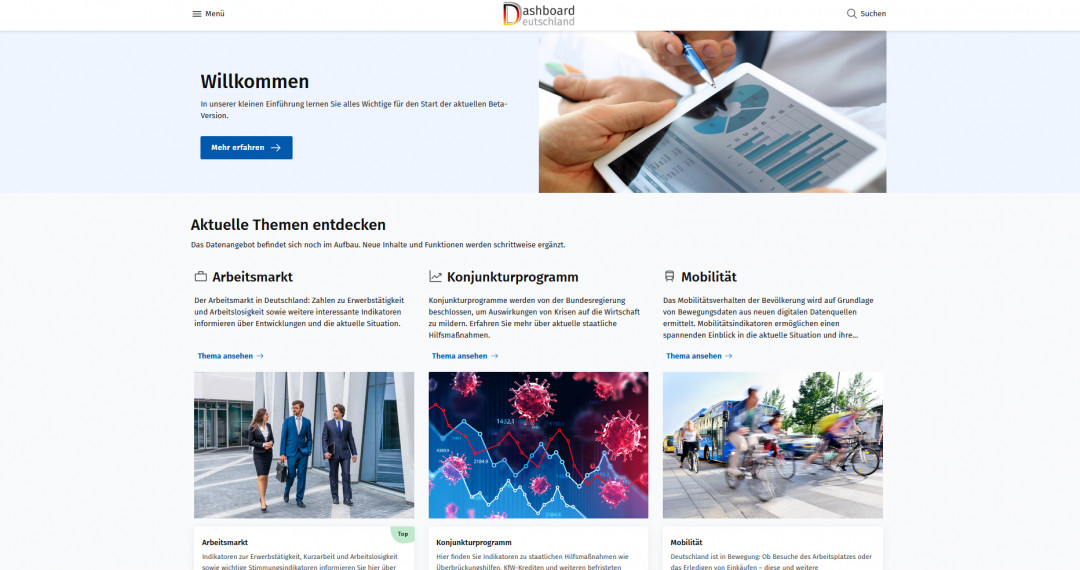 Zum Start des Angebots bietet das „Dashboard Deutschland“ bereits grundlegende Analysemöglichkeiten. Bis Mitte 2021 werden sowohl das inhaltliche Angebot als auch die technische Funktionalität weiter ausgebaut. Das „Dashboard Deutschland“ ist kostenfrei und ohne Registrierung nutzbar. Nach der Freischaltung am 15. Dezember 2020 ist das Angebot über die Internetauftritte des BMI, BMF, BMWi und des Statistischen Bundesamtes sowie über die Dashboard Deutschland-Webseite erreichbar.