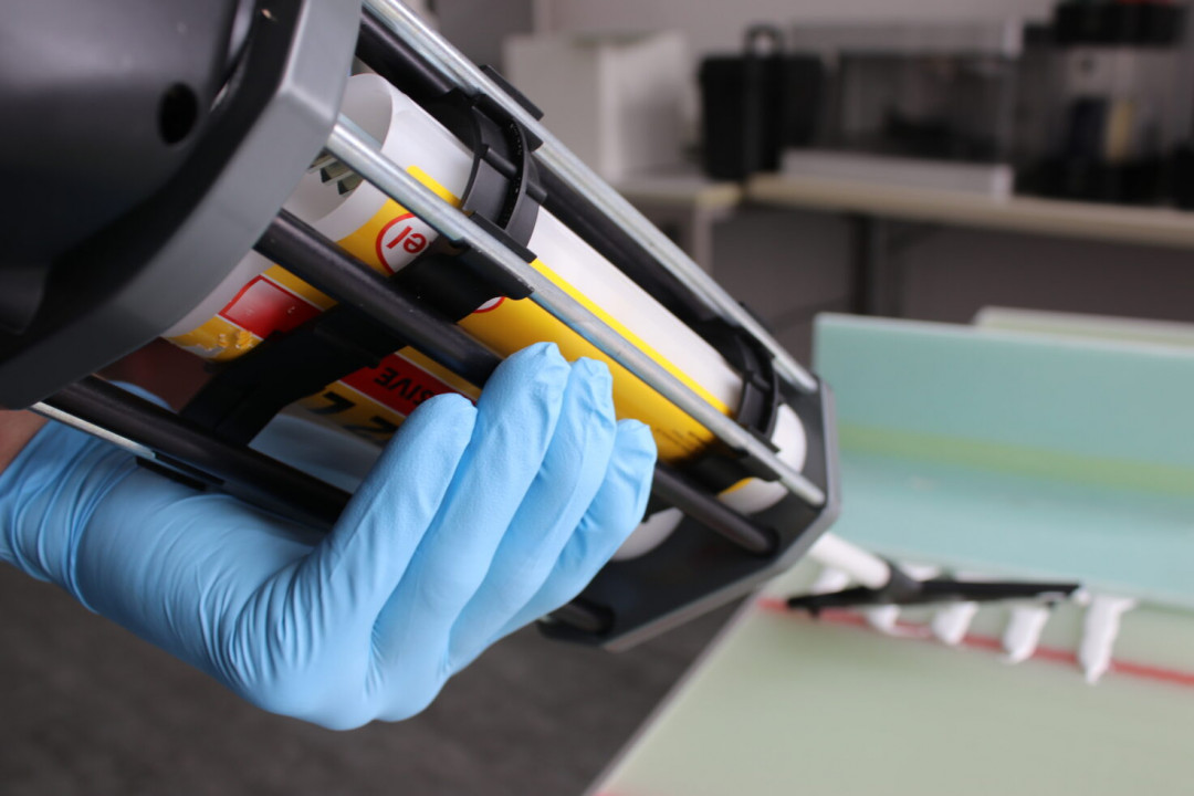 Der erfahrene Experte sieht den häufigsten Schutzbedarf beim Hand- und Hautschutz. Zu diesem gehören zunächst die passenden Handschuhe. Sie schützen vor den in Hochleistungsklebstoffen enthaltenen Chemikalien. Ergänzend kann ein Hitzeschutz nötig werden – etwa bei der Verarbeitung von Schmelzklebstoffen oder exotherm reagierenden 2-Komponenten Klebstoffen. Zu beachten ist dabei das passende Handschuhmaterial für den jeweiligen Klebstoff sowie etwaige Allergien des Anwenders. So können Nitrilhandschuhe eine Alternative für Latexallergiker sein. Beim stundenlangen Gebrauch von Handschuhen sollte die passende Hautpflege mitbedacht werden.