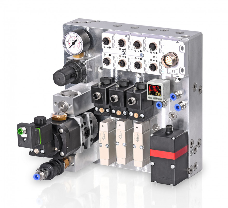 Hier kommt es auf absolute Ruhe der Sonotrode an, um die Bauteile nicht zu beschädigen. Diese ist jedoch nur gegeben, wenn die schnelle Abfolge von Triggerkraft, Schweißkraft und Haltekraft präzise durch die verbaute Pneumatikeinheit eingehalten wird. „Während die Triggerkraft dafür sorgt, dass die Werkstücke vorgepresst werden, setzt die Schweißkraft beim eigentlichen Verbindungsprozess der Kunststoffteile ein“, erklärt Unser. „Die Haltekraft sorgt für ein Erkalten der Schmelze unter Druck und erhöht dadurch die Qualität der Verbindung.“ Da bei herkömmlichen Pneumatikeinheiten oftmals keine Fein-Regulierung vorhanden ist, kann es bei der Ausübung der Kräfte zu einem ungenauen Verlauf kommen. Das wiederum wirkt sich direkt auf die Schweißkraft aus und hat ungleichmäßige Verbindungen zur Folge. „Der Vorgang des Schweißens soll etwa bei einem Funkschlüssel nur etwa 0,5 Sekunden dauern“, so Unser. „Gleichzeitig wird dieser Prozess rund 40 mal pro Minute wiederholt.“ Die Pneumatikkomponenten sind jedoch in der Regel mit Schläuchen versehen, sodass sich die Wege für die Druckluft und damit auch die Zykluszeit verlängern.