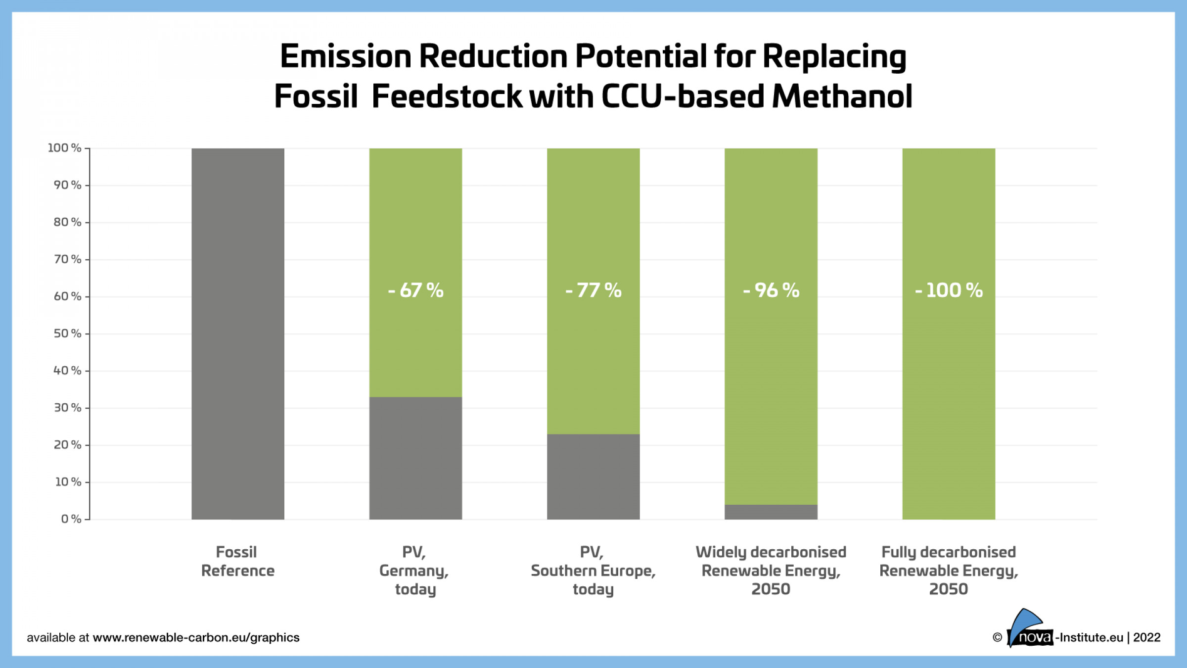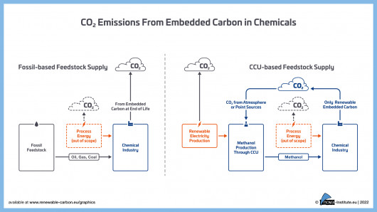 Bei einer vollständig dekarbonisierten Energieversorgung können hierdurch pro Jahr eine Menge von 3,7 Gt CO2 eingespart werden. Selbst im Vergleich zu den heutigen weltweiten Emissionen von 55,6 Gt CO2-Äquivalenten pro Jahr sind diese Einsparungen an Treibhausgasemissionen beträchtlich. Das Ergebnis zeigt, dass CCU eine vielversprechende Technologie zur Verringerung der Treibhausgasemissionen bei der Versorgung der Chemie mit eingebettetem Kohlenstoff sein kann, sofern ausreichend erneuerbare Energie zur Verfügung steht. CCU-basierter Kohlenstoff wird ein wichtiger Pfeiler der Zukunft der Chemie sein, die auf erneuerbaren Kohlenstoff setzt, auf CCU, Biomasse und Recycling. Damit CCU relevant zu einer klimafreundlichen Versorgung der chemischen Industrie mit Rohstoffen beitragen kann, müssen die weltweiten Photovoltaik- und Windkapazitäten rasch ausgebaut werden.
