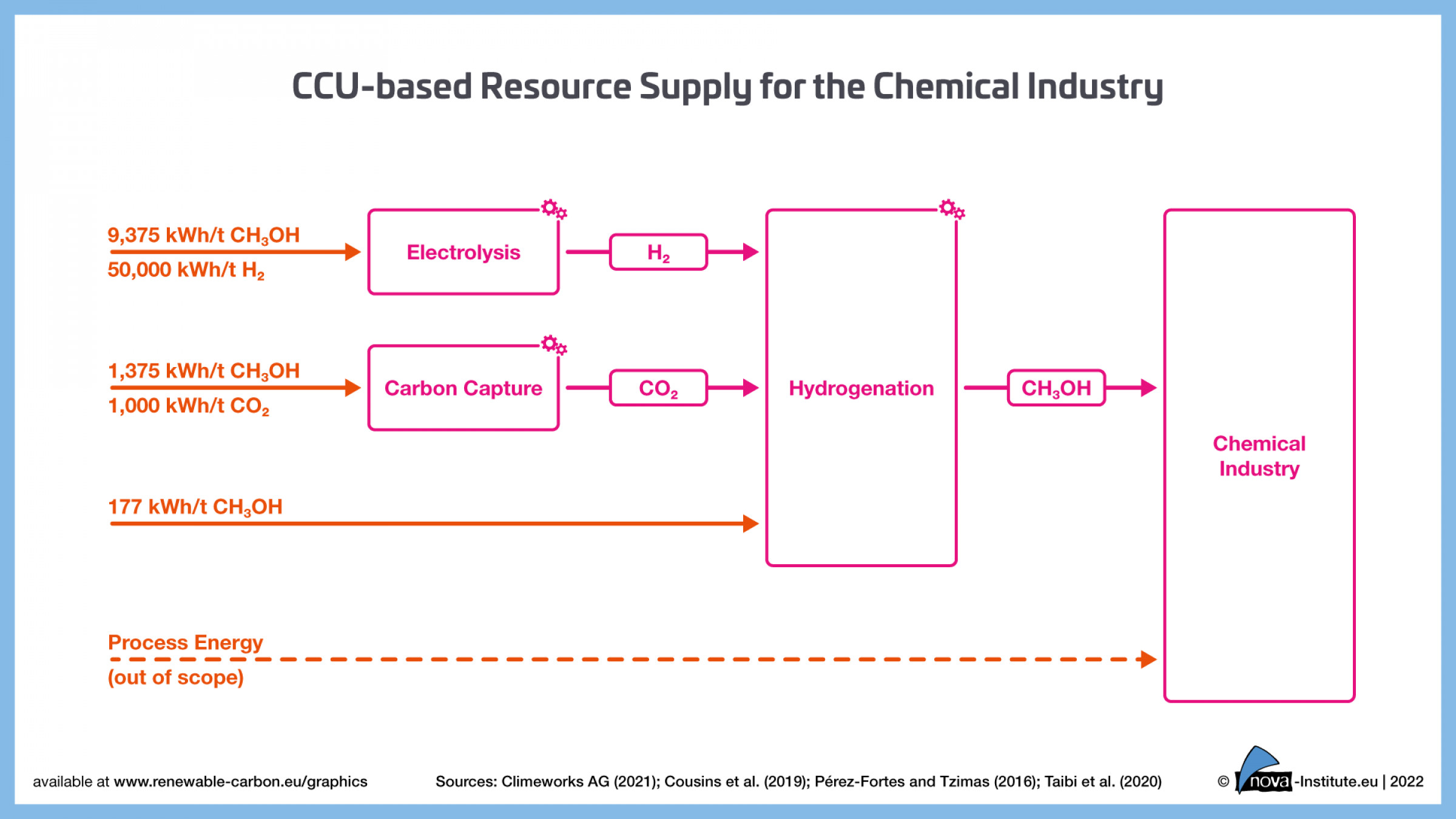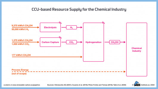 Die jährliche weltweite Nachfrage nach in Chemikalien und Folgeprodukten enthaltenem Kohlenstoff steigt dem Szenario nach von heute 450 Millionen Tonnen Kohlenstoff (Mt C) auf 1000 Mt C im Jahr 2050. Die Deckung dieses Bedarfs mit Methanol auf CCU-Basis bedeutet einen immensen Energiebedarf von 29,1 PWh/Jahr. Um diese Menge erneuerbare Energie bereitzustellen, sind große Anstrengungen notwendig.