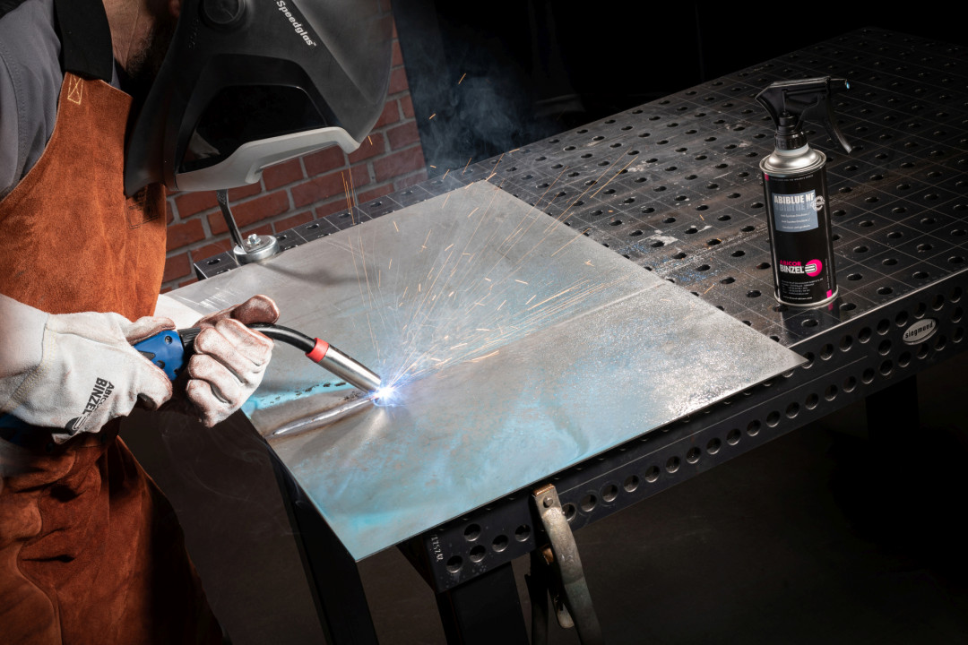 Aus dem Produktportfolio von ABICOR BINZEL empfiehlt sich als Trennmittel für das Werkstück das nicht brennbare ABIBLUE NF. Als Spritzerschutz für die Verschleißteile des Brenners sind das Keramikspray oder das Super Pistolenspray NF bestens geeignet.
