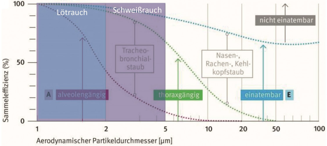 Beim Schweißen entstehen partikelförmige Emissionen und Gase, die gemeinhin als Schweißrauch bezeichnet werden. Es handelt sich dabei um Stoffgemische, deren chemische Zusammensetzungen und Konzentrationen von den eingesetzten Werkstoffen und den angewendeten Verfahren abhängig sind. Die freigesetzten Partikel können sowohl der alveolen-gängigen Staubfraktion (A-Fraktion) als auch der einatem-baren Staubfraktion (E-Fraktion) angehören. Des Weiteren können sogenannte ultrafeine Partikel entstehen, deren Durchmesser im Nanometerbereich liegen (Bild 1).