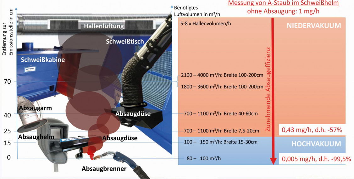 Ein weiterer Grund für die gesetzliche Forderung, so nah wie möglich an der Entstehungsstelle abzusaugen, ist aber auch, dass andernfalls oftmals die Atemorgane der Schweißer zwischen Entstehungsstelle und Absaugung liegen. Dies ist zum Beispiel bei Raumlüftungen der Fall. Eine Abscheidung des Schweißrauchs findet hier unter Umwälzung sehr großer Luftmengen und aus der Sicht des Gesundheitsschutzes zu spät statt.