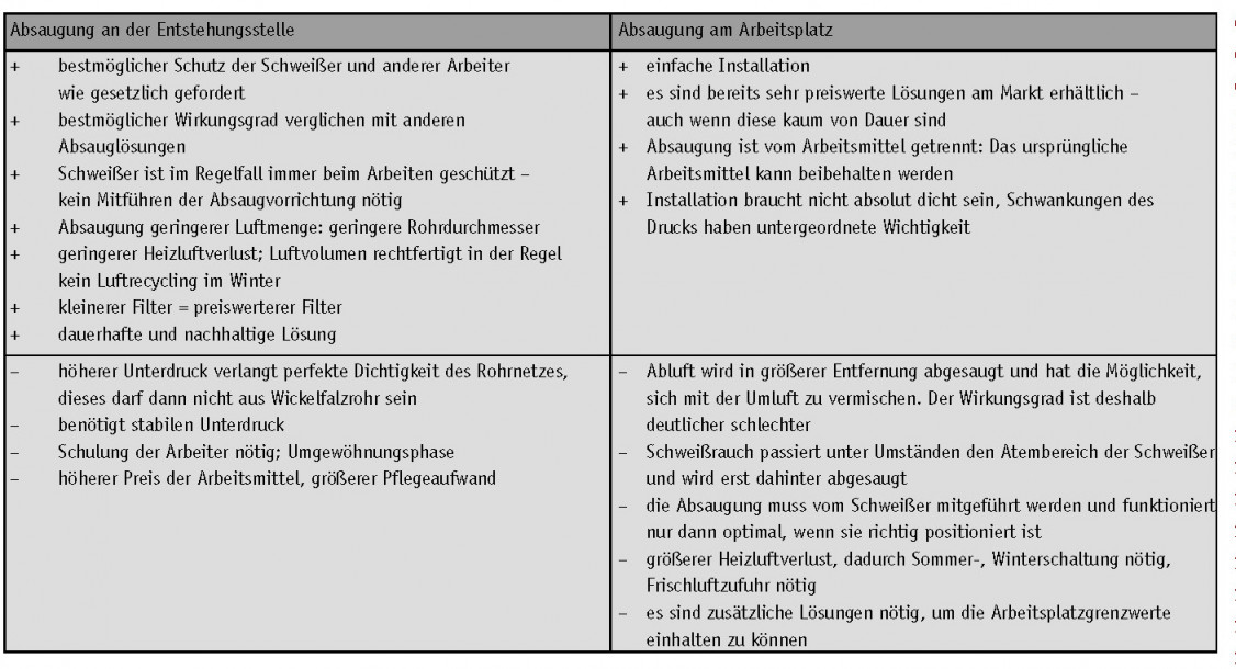 Der Vergleich zwischen der Absaugung an der Entstehungsstelle und der Absaugung am Arbeitsplatz ergibt verschiedene Vor- und Nachteile (Tabelle 1). Die Zielsetzung jeder Schweißrauchabsaugung sollte die Beibehaltung der Produktivität sowie der Schweißnahtqualität bei gleichzeitig bestmöglichem Schutz der Schweißer sein. Aus arbeitsschutztechnischer Sicht bieten Absaugbrenner den bestmöglichen Schutz für Schweißer und anderes Personal. Es sind hier keine zusätz-lichen Handgriffe vom Schweißer nötig, um seine Sicherheit zu gewährleisten. Er kann sich insofern komplett auf die Produktion konzentrieren und ist dabei geschützt. Absaugbrenner eignen sich sowohl für feste MIG-/MAG-Schweißarbeitsplätze als auch für mobile Arbeitsplätze. Es können kleine bis sehr große Werkstücke aus unterschiedlichen Werkstoffen und in unterschiedlichen Dicken bearbeitet werden.