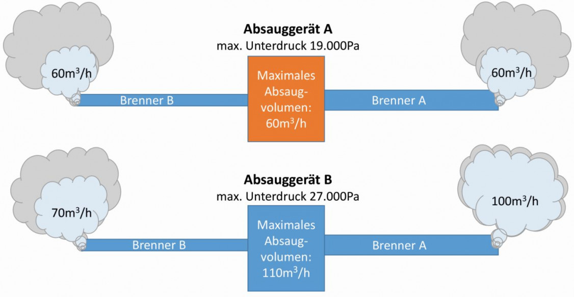 Häufig wird die Absaugung beim Test der Absaugbrenner ausgeklammert. Nur so ließe sich objektiv bewerten, welcher Brenner besser ist. Leider handelt es sich hier um einen Trugschluss. Das Werkzeug kann immer nur so gut sein, wie der Motor, der es antreibt. So kann ein Absauggerät mit einer schwachen Absaugleistung leicht zu der Überzeugung führen, dass die Absaugleistung zweier Brenner identisch ist, obwohl dieses Ergebnis ausschließlich vom Absauggerät und nicht vom Brenner verursacht wird. Den Unterschied macht erst ein Absauggerät mit stärkerer Saugleistung sichtbar. Hier macht tatsächlich das Luftvolumen, das durch den Brenner gesaugt werden kann, den Unterschied und kann insofern zu einem komplett anderen Ergebnis führen (Bild 4).