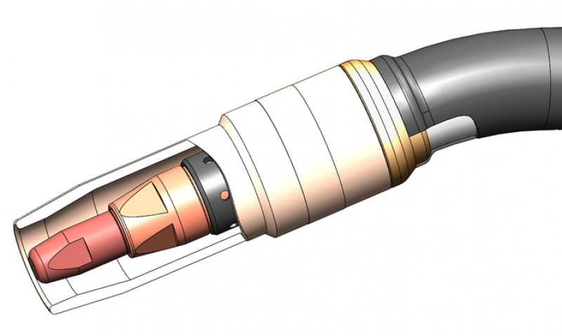 Die um 45 Grad gebogene Gasdüse ist die erste Wahl für das Schweißen von Kehlnähten oder T-Stößen. Mit dieser Sondergasdüse lässt sich sehr gut in Ecken schweißen, auch wenn man einen geraden Brennerhals benutzt. So kann beispielsweise auch eine Kehlnaht in einem engen Spalt geschweißt werden. Diese Gasdüsenform kann nur mit einem kompletten Verschleißteilesatz inklusive gebogener Stromdüse verwendet werden.