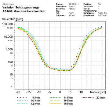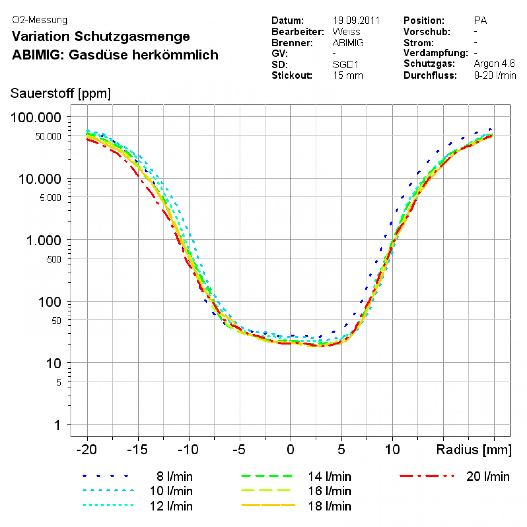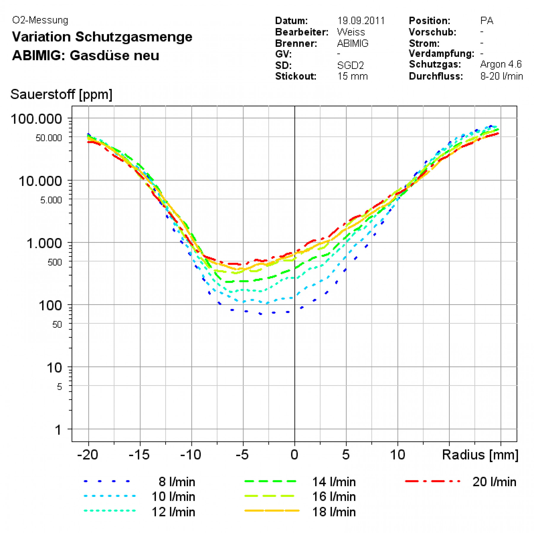 Die Ergebnisse der Sauerstoffmessung zeigen, wie unterschiedlich die Qualität der Schutzgasabdeckung bei den beiden zylindrischen Standard-Gasdüsenformen ist.