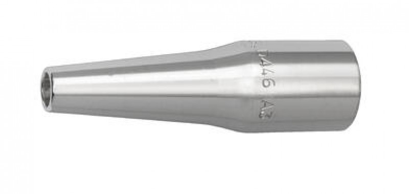 Diese Gasdüse läuft in Flaschenform zu. Dadurch erreicht sie auch schwer zugängliche Schweißstellen gut und erlaubt gleichzeitig eine gute Sicht auf das Werkstück. Um eine gute Schweißnaht zu erzielen, sollte die Form der Gasdüse mit der Stromdüse, die die Gasflussmenge ebenfalls beeinflusst, optimal abgestimmt sein, damit sie eine ausreichende Menge an Schutzgas durchlässt.