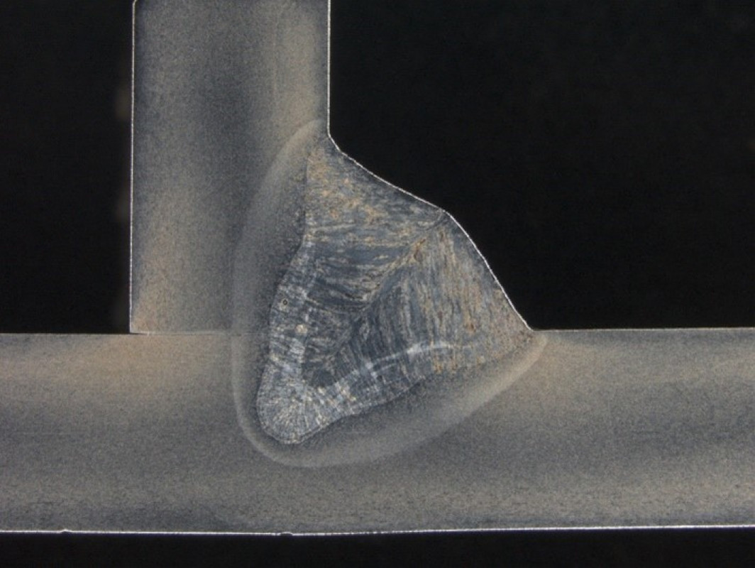 Das folgende Bild zeigt eine Schweißnaht in Querposition bei einer Plattenstärke von 6 mm. Verwendete Schweißparameter: