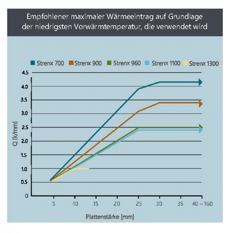 Beispielsweise umfasst die Strenx-Produktfamilie von SSAB Baustähle mit Streckgrenzen zwischen 700 und 1300 MPa. Abbildung 1 zeigt den maximal zulässigen Wärmeeintrag für verschiedene Plattenstärken von Stählen der Strenx-Produktfamilie von SSAB, wenn kein Vorwärmen vor dem Schweißen erfolgt. Die Abbildung verdeutlicht, dass der Wärmeeintrag bei den stärksten Klassen und dünnsten Platten 0,5 kJ/mm nicht überschreiten darf.