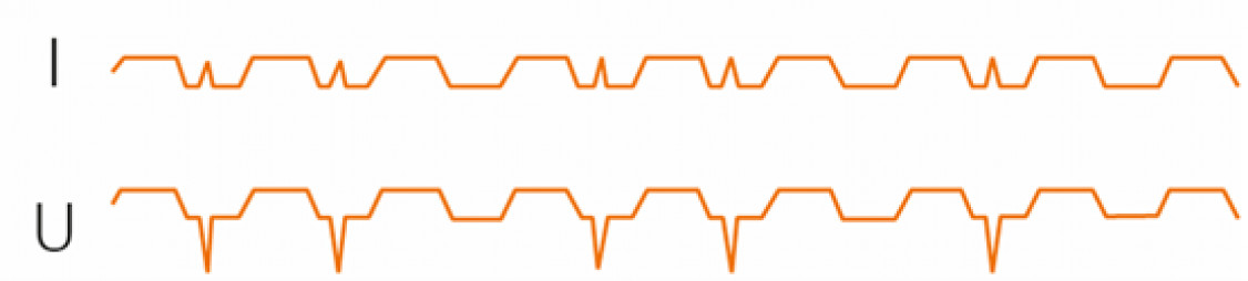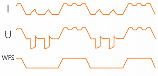 Beim Kurzlichtbogen misst der WiseSteel-Prozess die Kurzschlussfrequenz und passt die Spannung adaptiv an. Beginnt beispielsweise die Kurzschlussfrequenz zu sinken, wird die Spannung adaptiv niedriger eingestellt, was wiederum eine Erhöhung der Frequenz zur Folge hat. Schweißer nutzen Augen und Ohren, um die Kurzschlussfrequenz beim Kurzlichtbogenschweißen zu bestimmen. Beim richtigen Spannungslevel für einen Kurzlichtbogen ist die Kurzschlussfrequenz hoch genug, sodass der Schweißer einen gut fokussierten Lichtbogen sieht und ein sattes Brummgeräusch ohne Störungen hört. Der Kurzlichtbogenbereich des WiseSteel-Prozesses kann sowohl für 1-3 mm dünne Platten als auch für dickere Platten beim Wurzellagen- und Positionsschweißen eingesetzt werden.