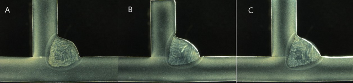 Beim Schweißen mit hohen Schweißgeschwindigkeiten steigt die Gefahr von Einbrandkerben, was an den Punkten A und B im Bild zu erkennen ist. Ein weiterer typischer Fehler beim Schweißen mit hoher Geschwindigkeit und geringem Wärmeeintrag ist übermäßige Konvexität der Schweißnaht. Hinsichtlich der übermäßigen Konvexität erfüllen alle Schweißnähte in der Abbildung die Anforderungen der EN ISO 5817 Klasse B.