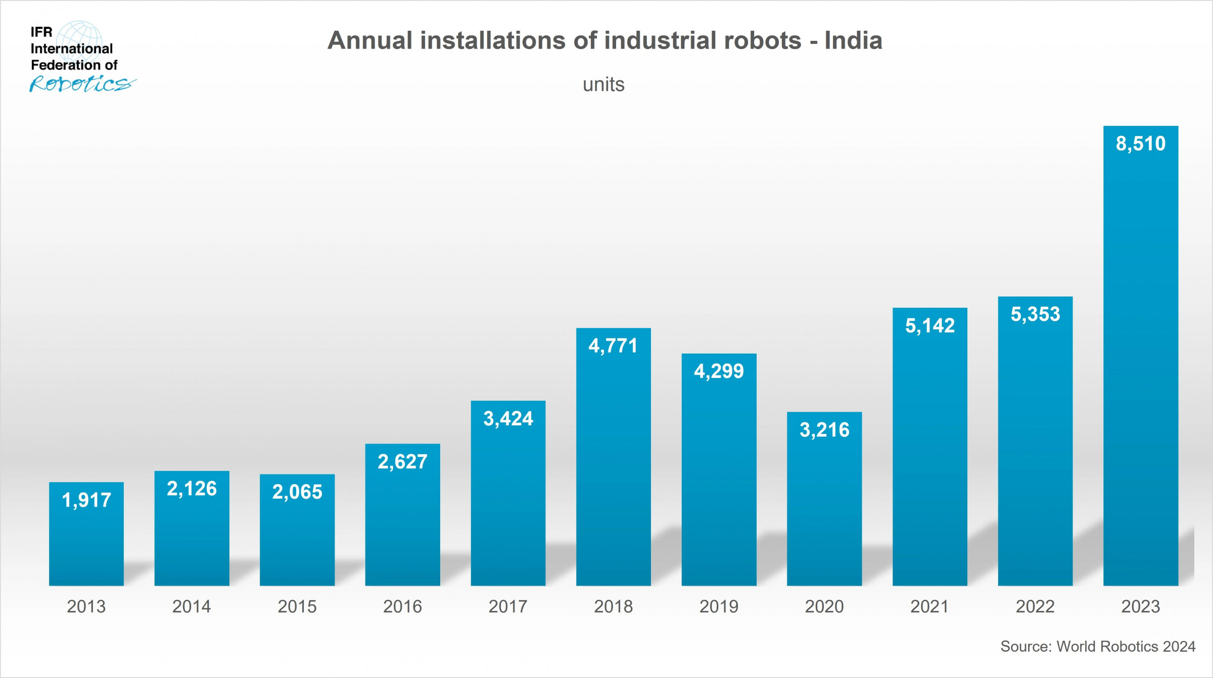 Indien ist eines der am schnellsten wachsenden Schwellenländer Asiens. Die Zahl der installierten Roboter stieg im Jahr 2023 um 59 % auf 8.510 Einheiten. Das ist ein neuer Höchststand. Die Nachfrage aus der Automobilindustrie stieg auf 3.551 Einheiten - ein Zuwachs von 139 %. Sowohl die Automobilhersteller als auch die Zulieferer trugen zu dieser Entwicklung bei.