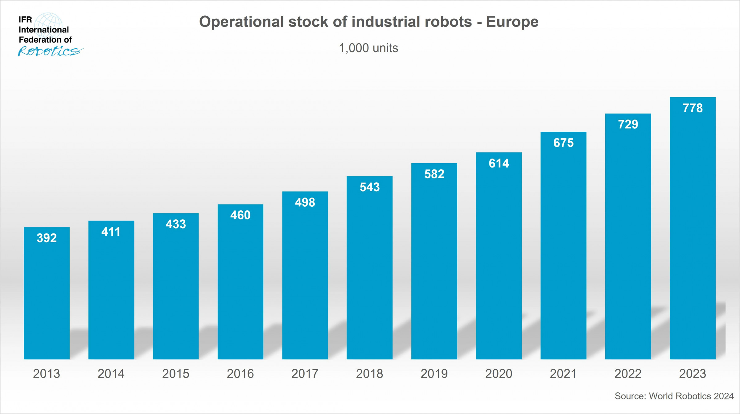 In Europa stieg die Zahl der neu installierten Roboter auf einen neuen Höchststand von 92.393 Einheiten im Jahr 2023. Das ist ein Plus von 9 %. 80 % der Industrie-Roboter wurden an Standorten in der Europäischen Union abgesetzt (73.534 Einheiten, + 2 %). Zahlreiche Projekte kamen 2023 zum Abschluss, und der Auftragsbestand aus den vollen Orderbüchern wurde abgearbeitet. Zudem profitierte die Roboternachfrage von einem Nearshoring-Trend. Aufgeschlüsselt nach Branchen wurde das Wachstum 2023 stark von der Automobilindustrie angetrieben, die in traditionell starken Herstellerländern wie Spanien (5.053 Einheiten, + 31 %), aber auch in kleineren Märkten wie der Slowakei (2.174 Einheiten, + 48 %) oder Ungarn (1.657 Einheiten, + 31 %) investierte.