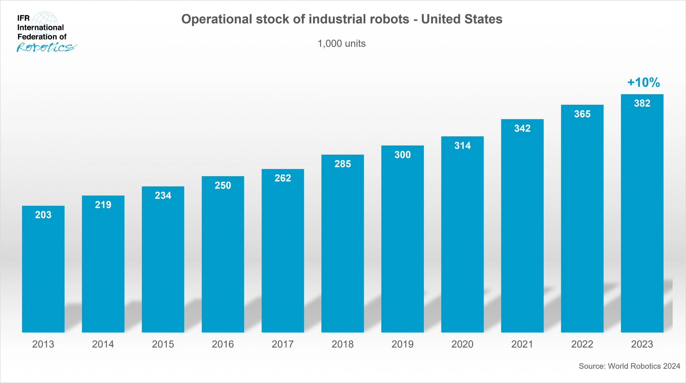 „Die neue World-Robotics-Statistik zeigt in der Fertigung ein Allzeithoch bei der weltweiten Automation mit Industrie-Robotern“, sagt Marina Bill, Präsidentin der International Federation of Robotics. „Die Zahl von 541.302 neu installierten Einheiten aus dem Jahr 2023 ist das zweitbeste jemals gemessene Jahresergebnis. Sie liegt nur 2 % unter dem Rekord von 552.946 installierten Einheiten im Jahr 2022.“