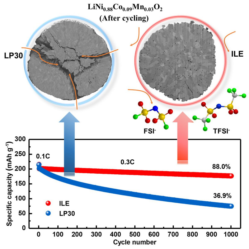 Eine Lösung haben nun Forschende am Karlsruher Institut für Technologie (KIT) und am Helmholtz-Institut Ulm – Elektrochemische Energiespeicherung (HIU) gefunden. Wie sie im Magazin Joule berichten, setzen sie eine vielversprechende neue Materialkombination ein. Sie verwenden eine kobaltarme, nickelreiche Schichtkathode (NCM88). Diese bietet eine hohe Energiedichte. Mit dem üblicherweise verwendeten kommerziell erhältlichen organischen Elektrolyten (LP30) lässt die Stabilität allerdings stark zu wünschen übrig. Die Speicherkapazität sinkt mit steigender Zahl der Ladezyklen. Warum das so ist, erklärt Professor Stefano Passerini, Direktor des HIU und Leiter der Forschungsgruppe Elektrochemie der Batterien: „Im Elektrolyten LP30 entstehen Partikelrisse an der Kathode. Innerhalb dieser Risse reagiert der Elektrolyt und zerstört die Struktur. Zudem bildet sich eine dicke moosartige lithiumhaltige Schicht auf der Kathode.“