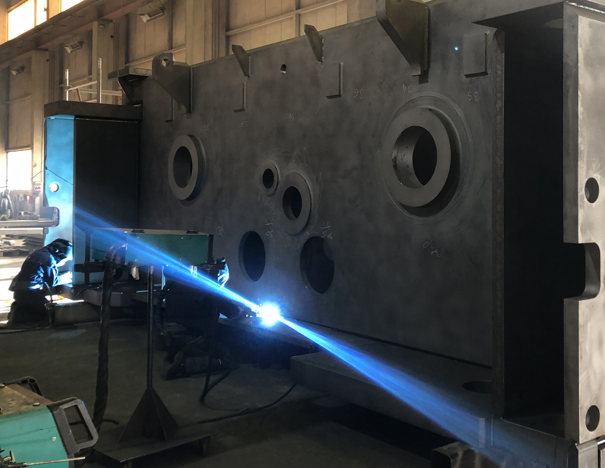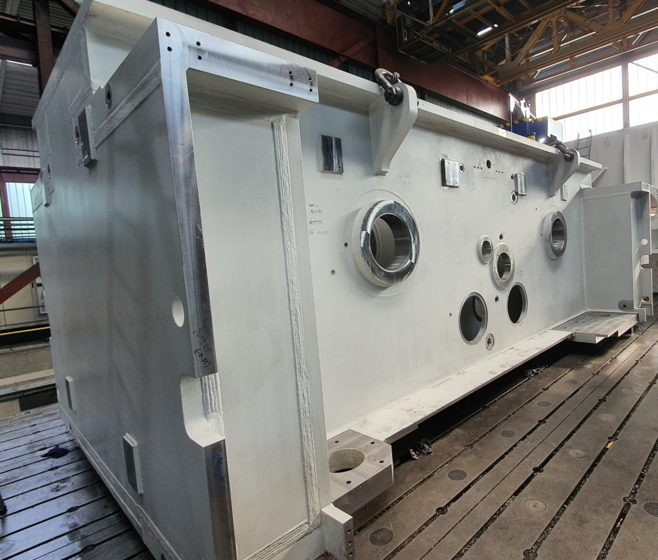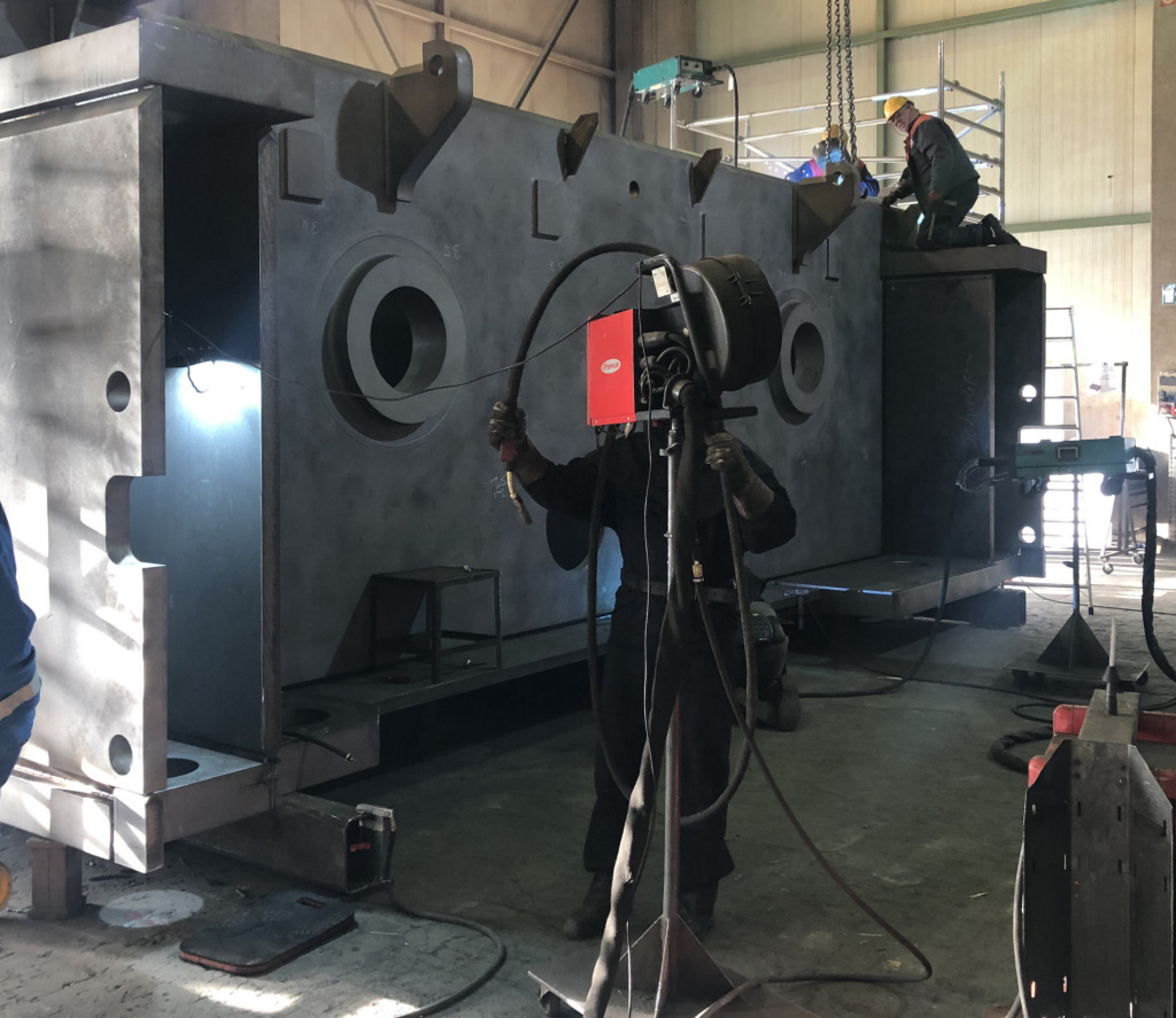 Die mechanische Endbearbeitung dieser Bohrungen erfolgte bei Jung Großmechanik auf einem Skoda-Bohrwerk nach den strikten Anforderungen von ANDRITZ Kaiser für Form- und Lagetoleranz. „Um eine 500 Millimeter dicke Welle durch vier Wände hindurchzuführen und die nötige Steifigkeit zu gewährleisten, müssen Zylindrizität, Fluchtung und Koaxialität auf ein bis drei Hundertstel genau sein“, so Steffen Groß. Damit während dieser Bearbeitung keine Vibrationen auftreten, hatte Jebens an den Zwischenwänden spezielle Verstärkungen montiert. Das exakte Fluchten erfolgte abschließend bei Jung Großmechanik gemeinsam mit ANDRITZ Kaiser per Lasertracker. Jebens hatte dafür extra kleine Bohrungen für Nullpunktmesser angebracht, sodass das Messergebnis auch später immer wieder nachvollzogen werden kann.
