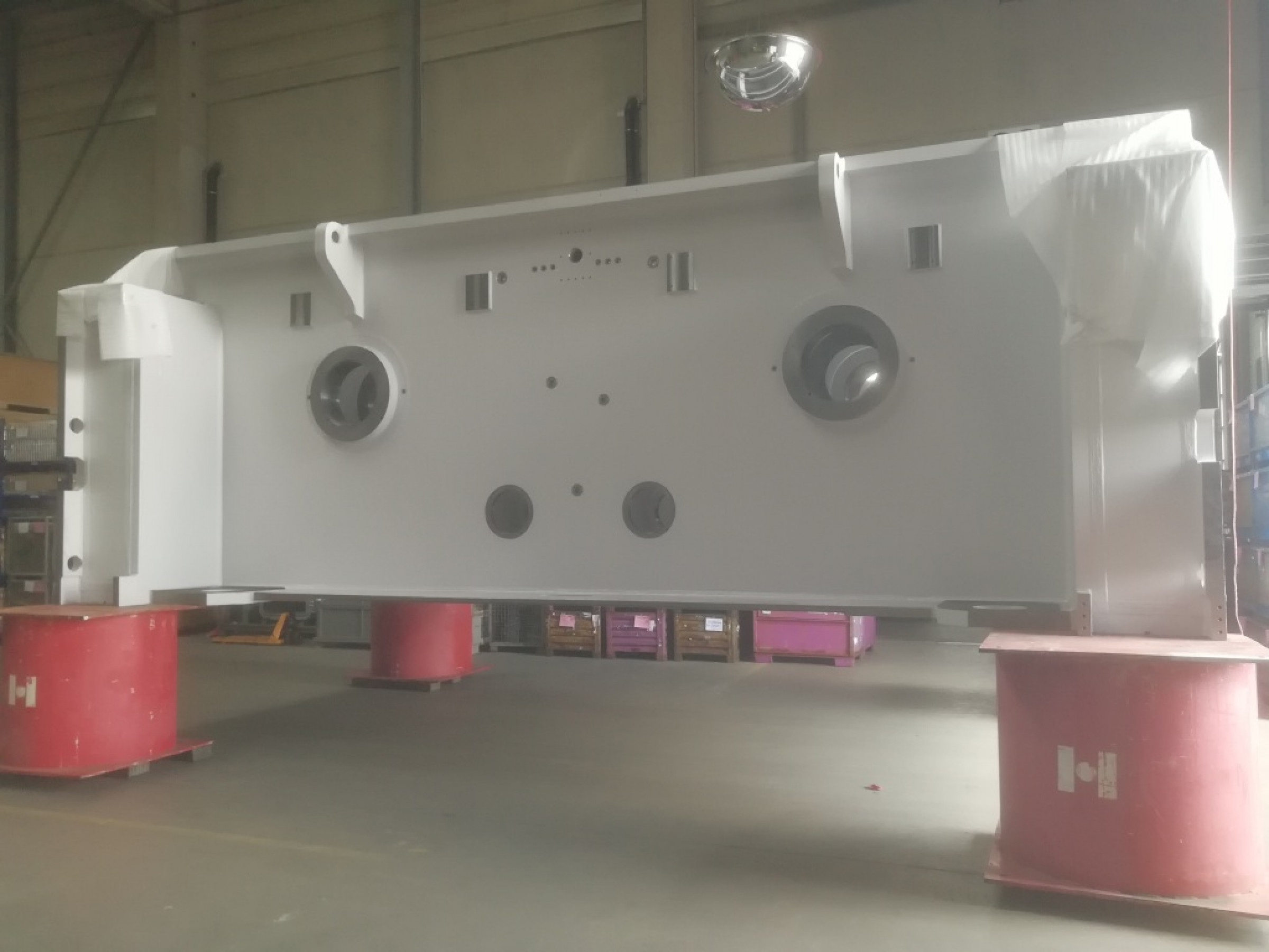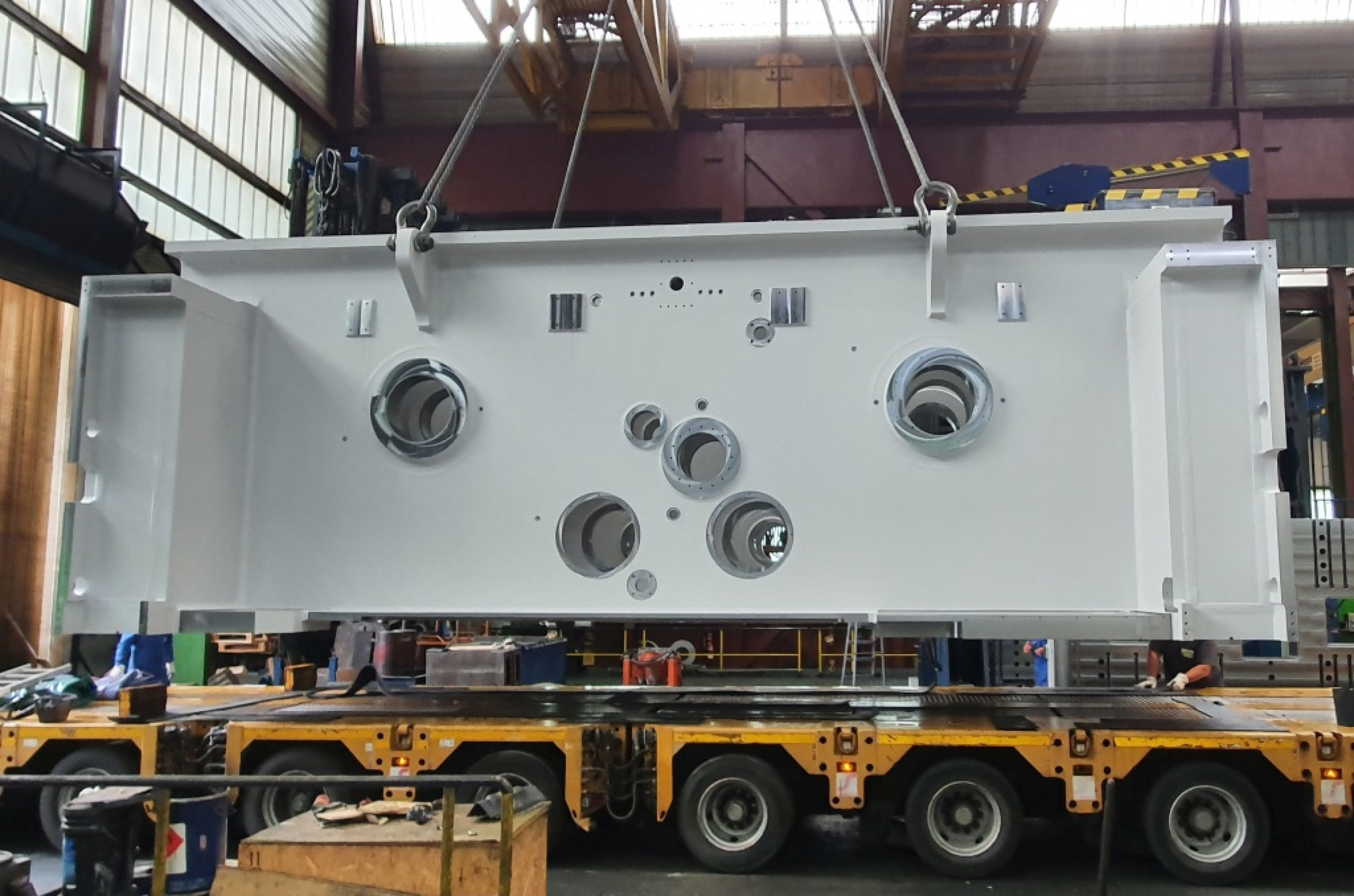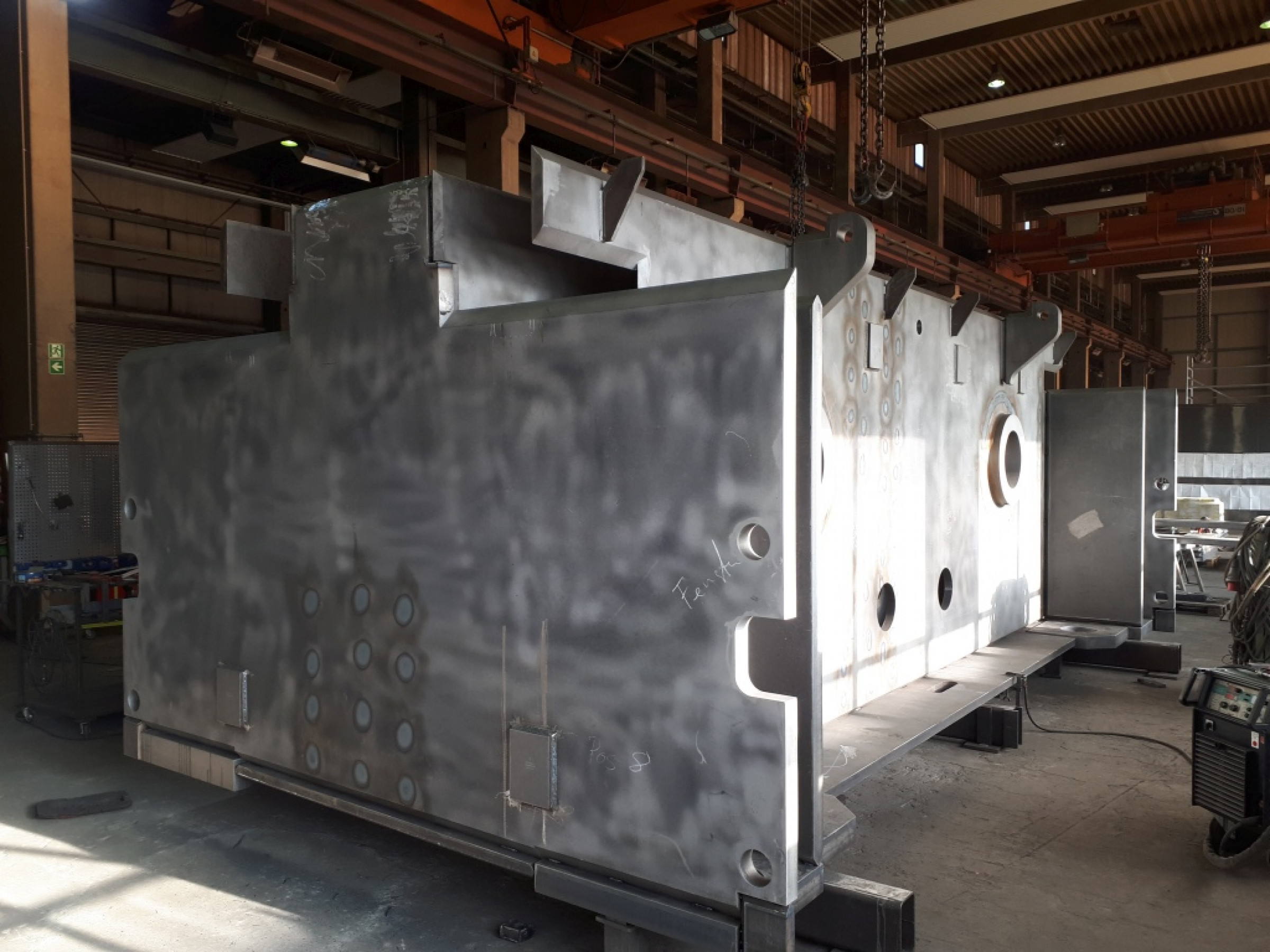 Die mechanische Endbearbeitung dieser Bohrungen erfolgte bei Jung Großmechanik auf einem Skoda-Bohrwerk nach den strikten Anforderungen von ANDRITZ Kaiser für Form- und Lagetoleranz. „Um eine 500 Millimeter dicke Welle durch vier Wände hindurchzuführen und die nötige Steifigkeit zu gewährleisten, müssen Zylindrizität, Fluchtung und Koaxialität auf ein bis drei Hundertstel genau sein“, so Steffen Groß. Damit während dieser Bearbeitung keine Vibrationen auftreten, hatte Jebens an den Zwischenwänden spezielle Verstärkungen montiert. Das exakte Fluchten erfolgte abschließend bei Jung Großmechanik gemeinsam mit ANDRITZ Kaiser per Lasertracker. Jebens hatte dafür extra kleine Bohrungen für Nullpunktmesser angebracht, sodass das Messergebnis auch später immer wieder nachvollzogen werden kann.