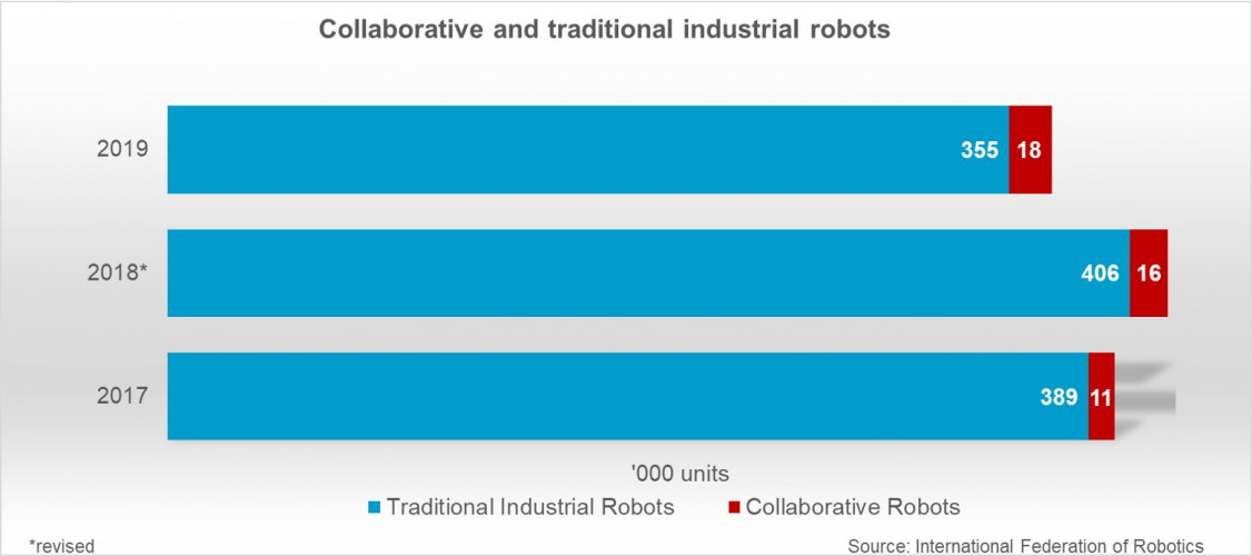 Der Einsatz von kollaborativen Robotern (Cobots), die mit den Menschen Hand-in-Hand und ohne Schutzzaun zusammenarbeiten können, ist auf dem Vormarsch. So stieg der Absatz von Cobots 2019 um 11 Prozent – ganz entgegen dem Trend für die traditionellen Industrieroboter. Da immer mehr Hersteller kollaborative Roboter anbieten und sich gleichzeitig das Anwendungsspektrum vergrößert, stieg der Marktanteil 2019 auf 4,8 Prozent. Trotz dieser dynamischen Entwicklung steckt der Markt noch immer in den Kinderschuhen. Von den 373.000 abgesetzten Industrie-Robotern sind bisher nur rund 18.000 Einheiten Cobots.